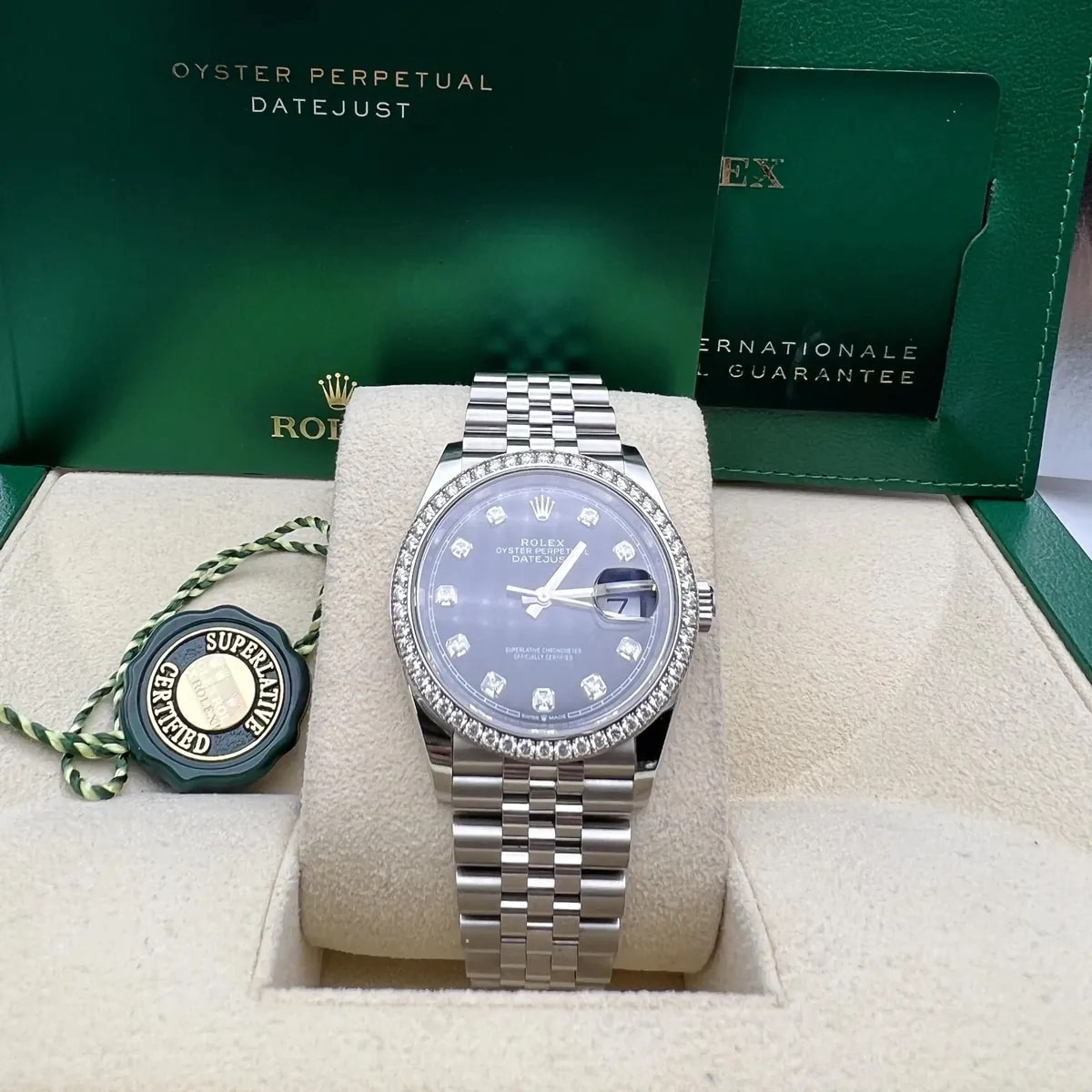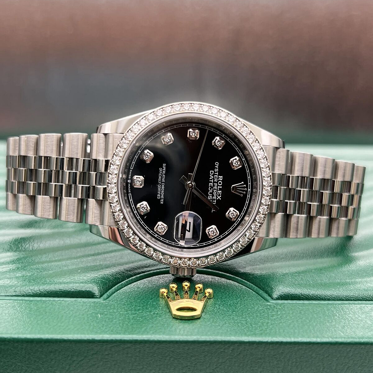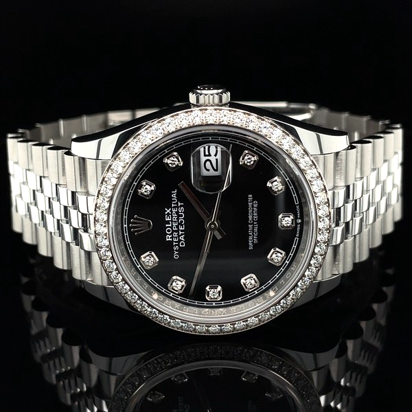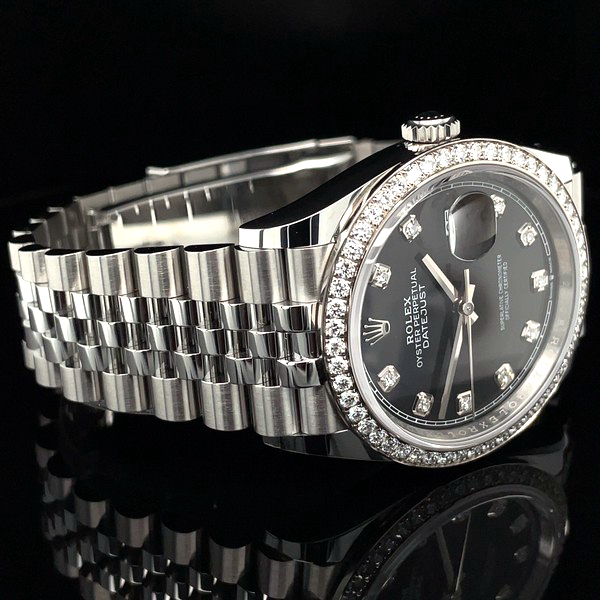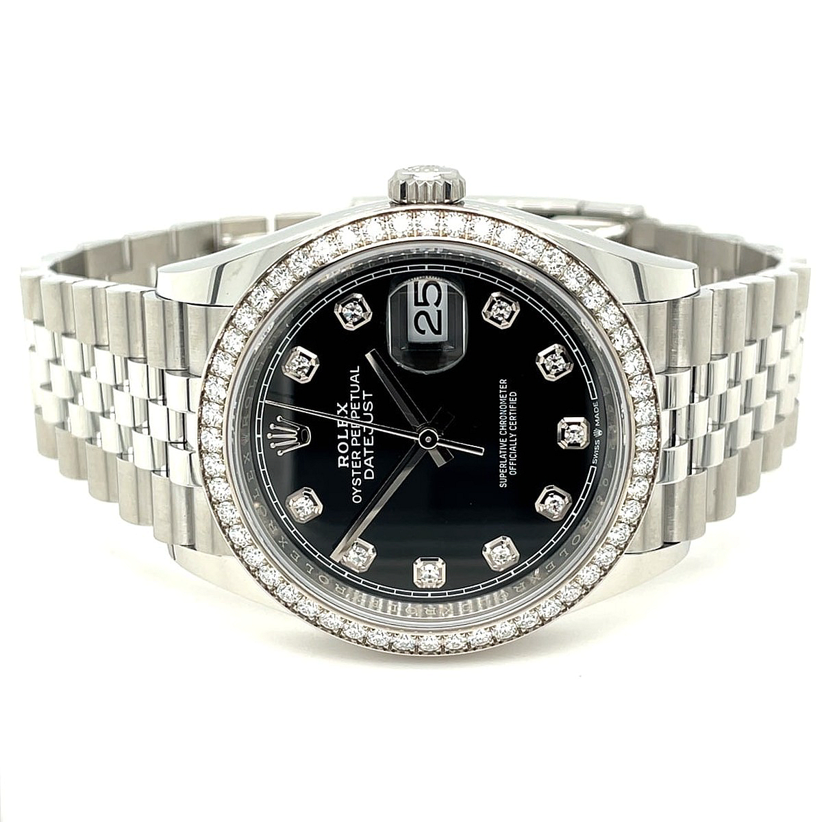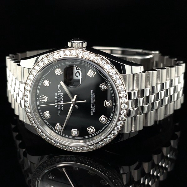 Rolex Lady-Datejust 26 Black Dial Women's Watch 179384-0002. This 26mm watch features a stainless steel case with a solid 18k white gold diamond-set bezel and is fitted with an Oyster bracelet. The black dial has diamond hour markers and a date window displayed under a cyclops lens at 3 o'clock. It is powered by the Rolex Caliber 2235 self-winding automatic COSC Superlative Chronometer certified movement with a 48 hour power reserve.