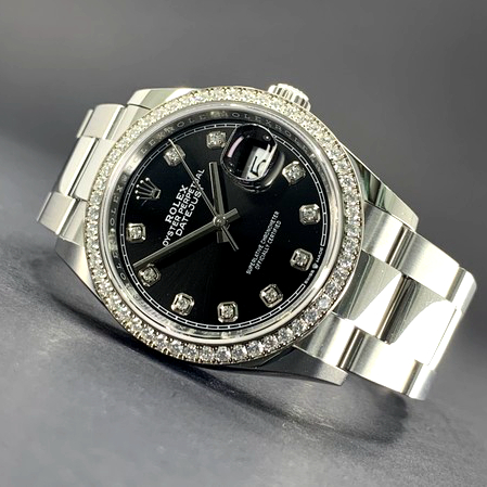Rolex Lady-Datejust 26 Black Dial Women's Watch 179384-0002. This 26mm watch features a stainless steel case with a solid 18k white gold diamond-set bezel and is fitted with an Oyster bracelet. The black dial has diamond hour markers and a date window displayed under a cyclops lens at 3 o'clock. It is powered by the Rolex Caliber 2235 self-winding automatic COSC Superlative Chronometer certified movement with a 48 hour power reserve.
