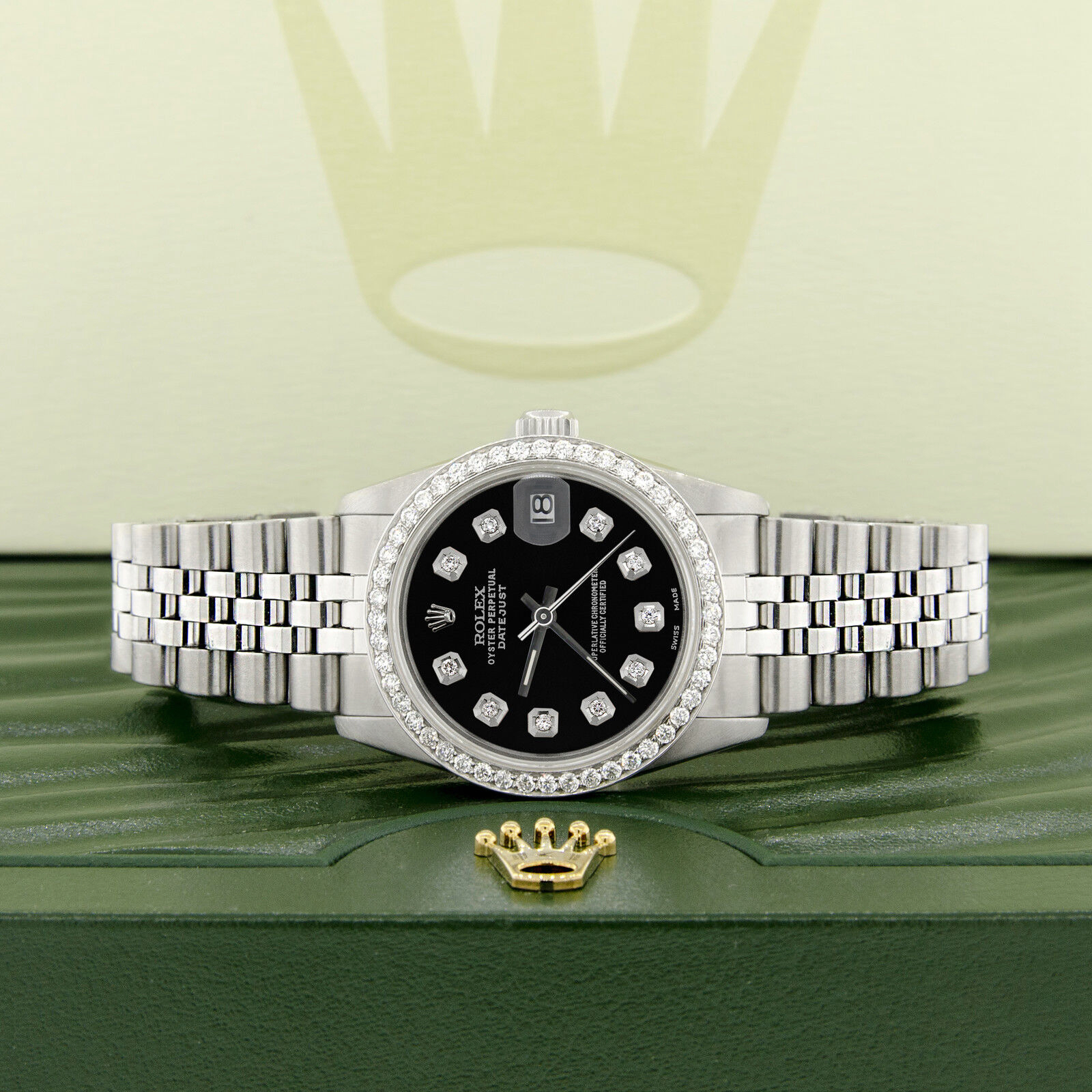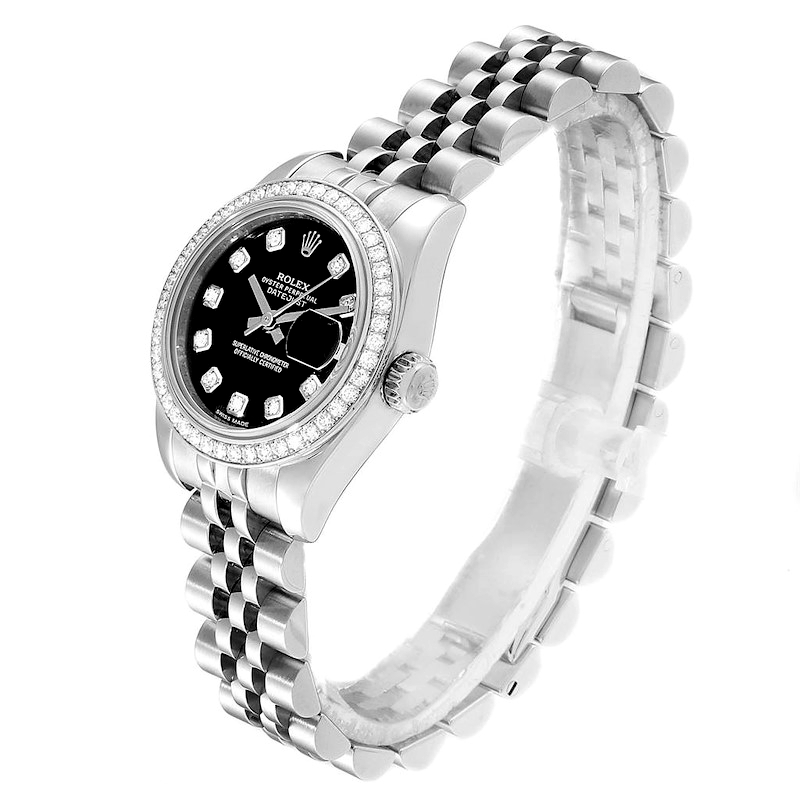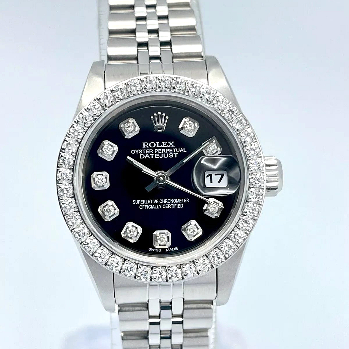 Rolex Lady-Datejust 26 Black Dial Women's Watch 179384-0002. This 26mm watch features a stainless steel case with a solid 18k white gold diamond-set bezel and is fitted with an Oyster bracelet. The black dial has diamond hour markers and a date window displayed under a cyclops lens at 3 o'clock. It is powered by the Rolex Caliber 2235 self-winding automatic COSC Superlative Chronometer certified movement with a 48 hour power reserve.