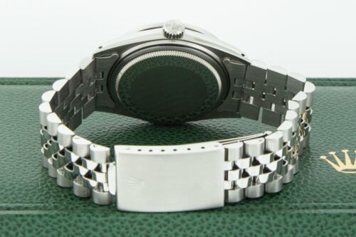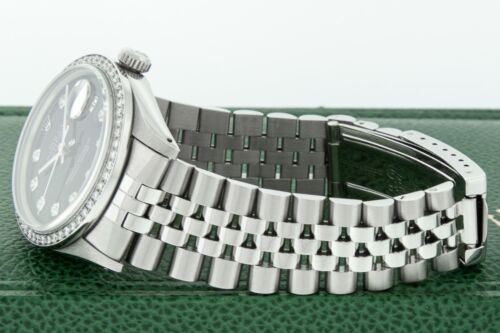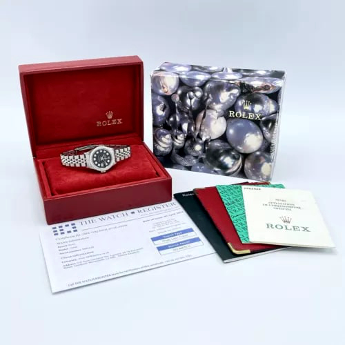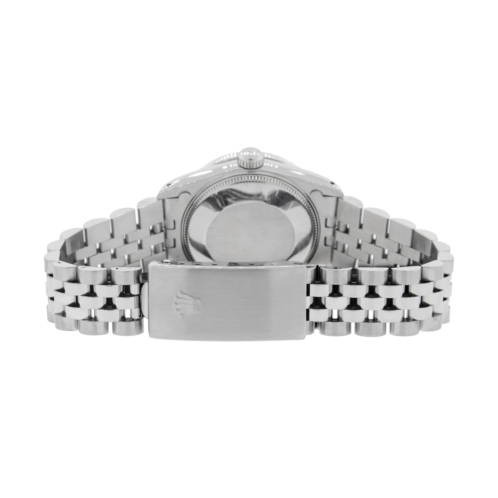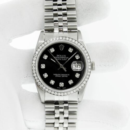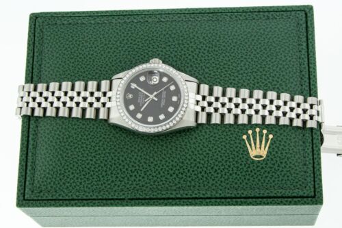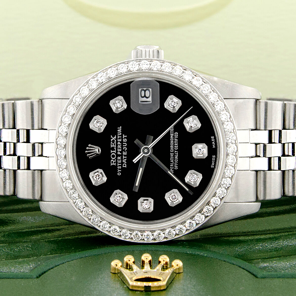 Rolex Lady-Datejust 26 Black Dial Women's Watch 179384-0002. This 26mm watch features a stainless steel case with a solid 18k white gold diamond-set bezel and is fitted with an Oyster bracelet. The black dial has diamond hour markers and a date window displayed under a cyclops lens at 3 o'clock. It is powered by the Rolex Caliber 2235 self-winding automatic COSC Superlative Chronometer certified movement with a 48 hour power reserve.