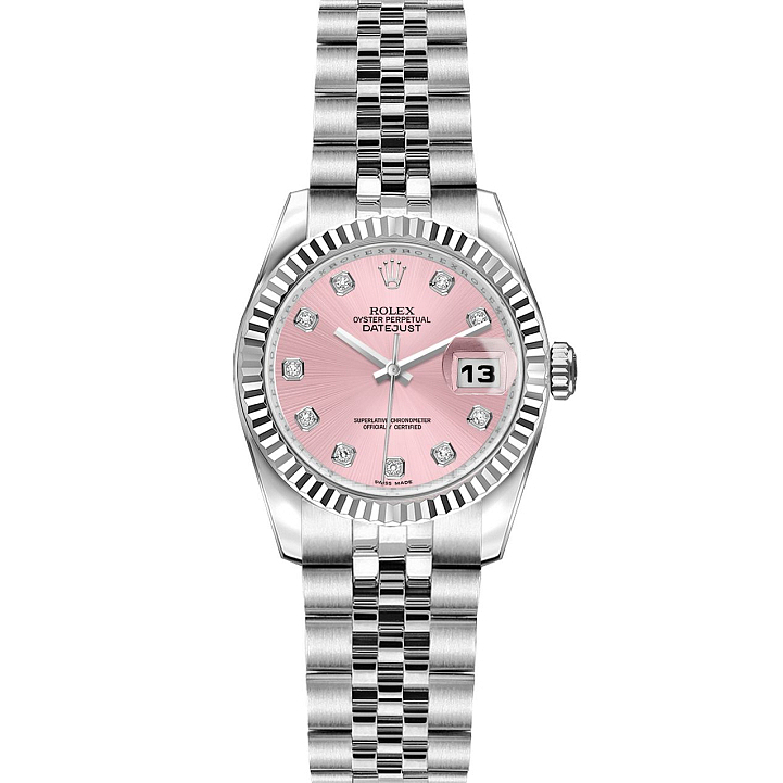The Oyster case is matched with a diamond-encrusted bezel, and the sides of the case and lugs reflect an elegant luster, making the outline of the 28 mm Oyster case more prominent and more attractive. As a Rolex classic ladies' watch, the ladies' timepiece is the continuation and sublimation of the brand's classic timepiece, and has always been synonymous with elegant style and precise timepieces.