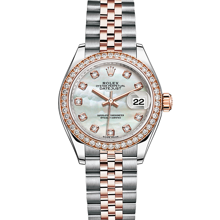 The Oyster Perpetual Ladies Datejust Watch Everose Gold and Oystersteel models, with a white mother-of-pearl dial set with diamonds and a Jubilee strap.