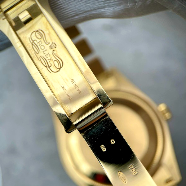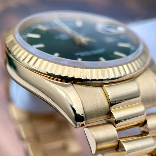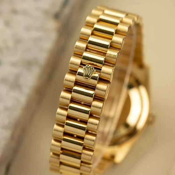 The Rolex fluted bezel is a mark of distinction. Originally, the fluting of the Oyster bezel had a functional purpose: it served to screw the bezel onto the case helping to ensure the waterproofness of the watch. It was therefore identical to the fluting on the case back, which was also screwed onto the case for waterproofness, using specific Rolex tools. Over time, the fluting became an aesthetic element, a genuine Rolex signature feature. Today the fluted bezel is a mark of distinction, in gold on this Day-Date 40.