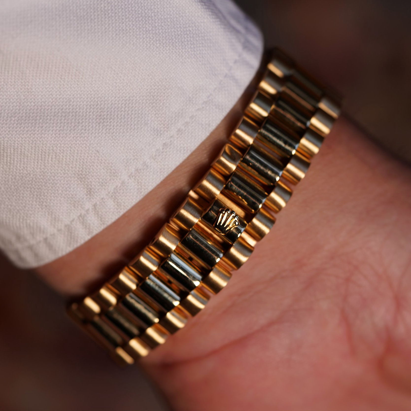 The design, development and production of Rolex bracelets and clasps, as well as the stringent tests they face, involve advanced high technology. And, as with all the components of the watch, aesthetic controls by the human eye guarantee impeccable beauty. The President bracelet, with its semi-circular three piece links, was created in 1956 for the launch of the Oyster Perpetual Day-Date. It represents the ultimate in refinement and comfort and is always made of carefully selected precious metals.