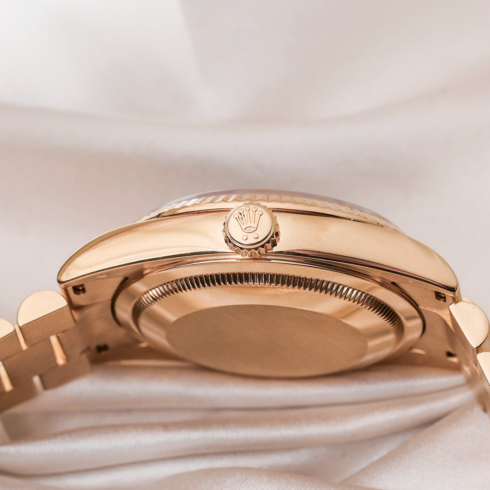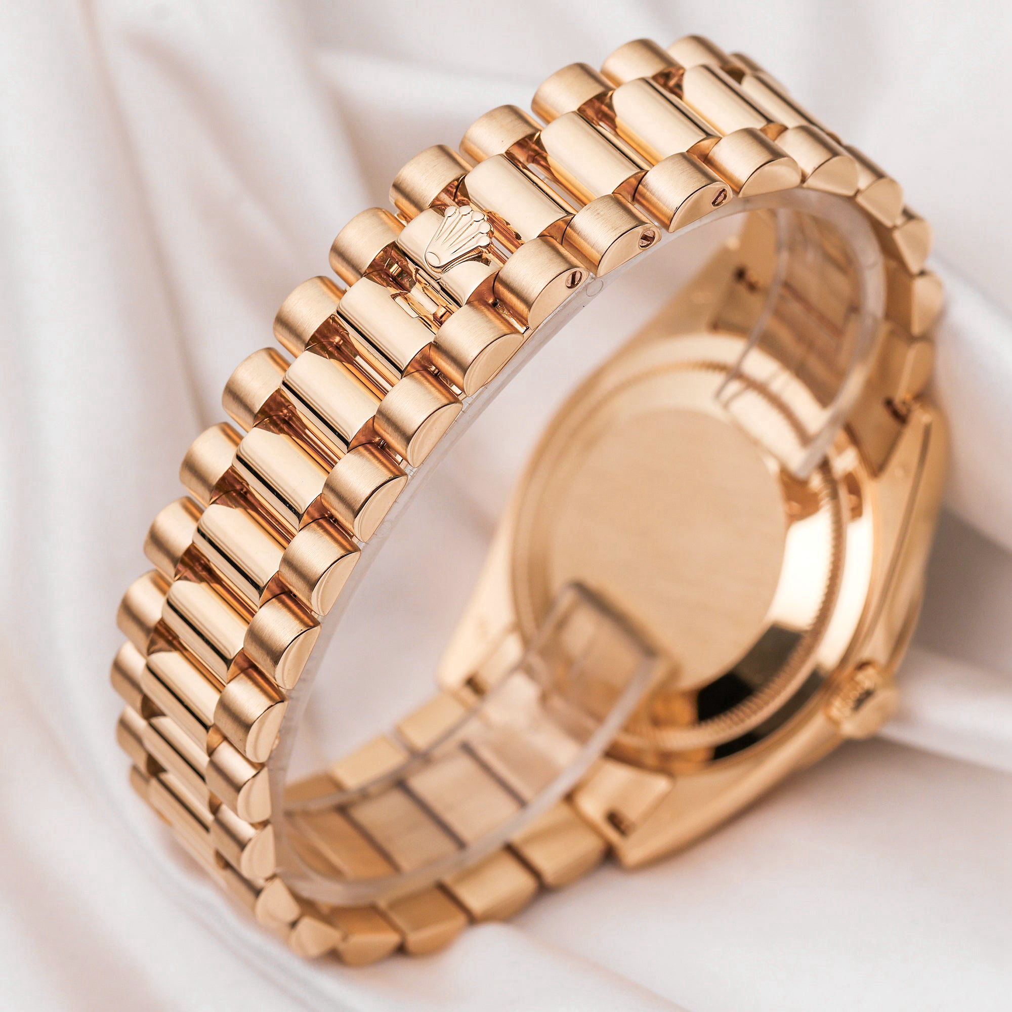The Rolex fluted bezel is a mark of distinction. Originally, the fluting of the Oyster bezel had a functional purpose: it served to screw the bezel onto the case helping to ensure the waterproofness of the watch. It was therefore identical to the fluting on the case back, which was also screwed onto the case for waterproofness, using specific Rolex tools. Over time, the fluting became an aesthetic element, a genuine Rolex signature feature. Today the fluted bezel is a mark of distinction, in gold on this Day-Date 40.