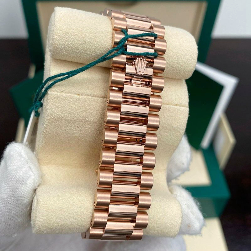 The design, development and production of Rolex bracelets and clasps, as well as the stringent tests they face, involve advanced high technology. And, as with all the components of the watch, aesthetic controls by the human eye guarantee impeccable beauty. The President bracelet, with its semi-circular three piece links, was created in 1956 for the launch of the Oyster Perpetual Day-Date. It represents the ultimate in refinement and comfort and is always made of carefully selected precious metals.