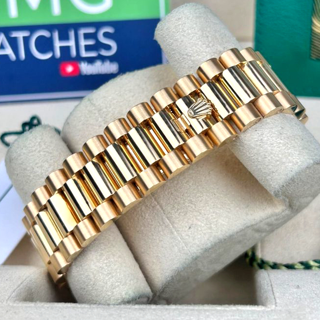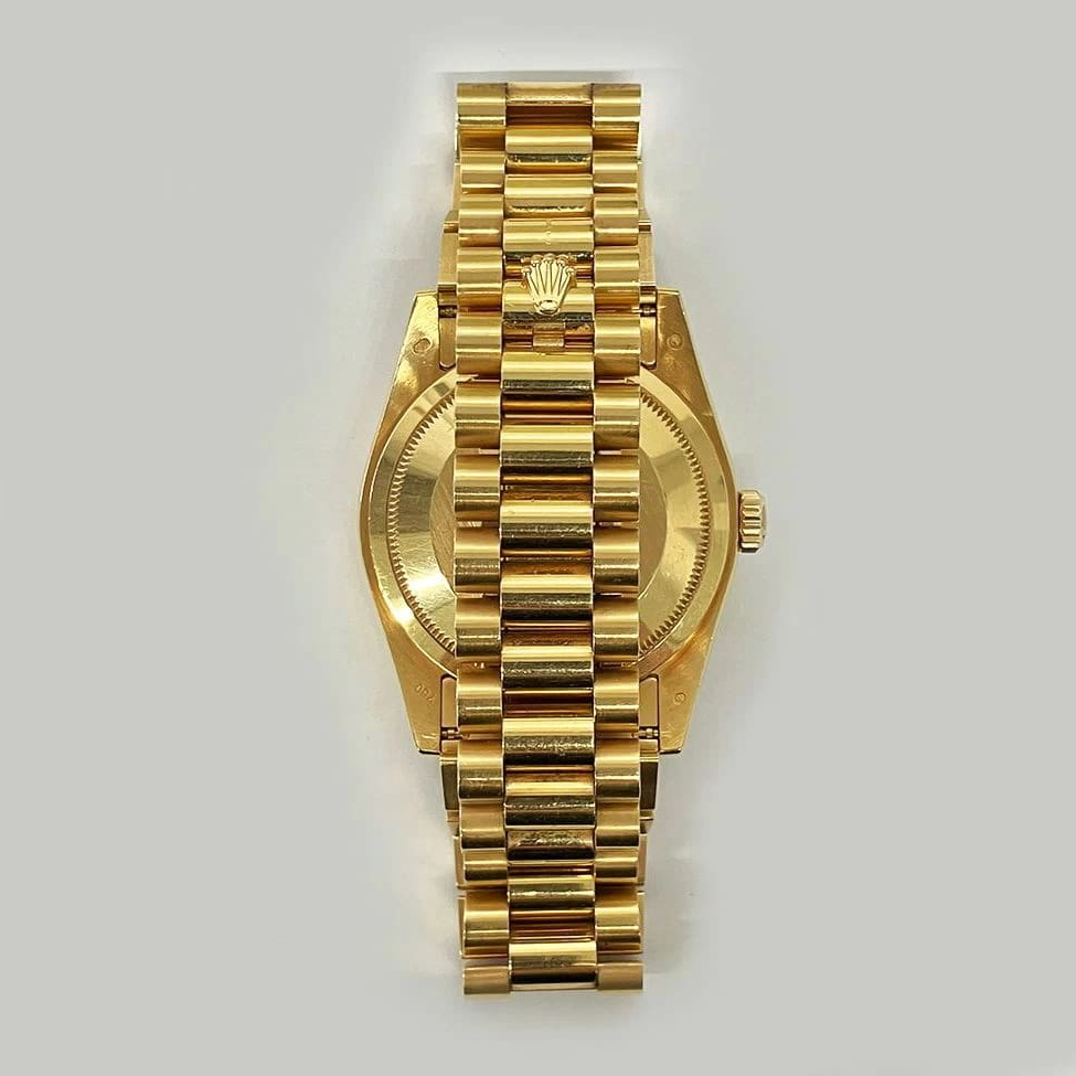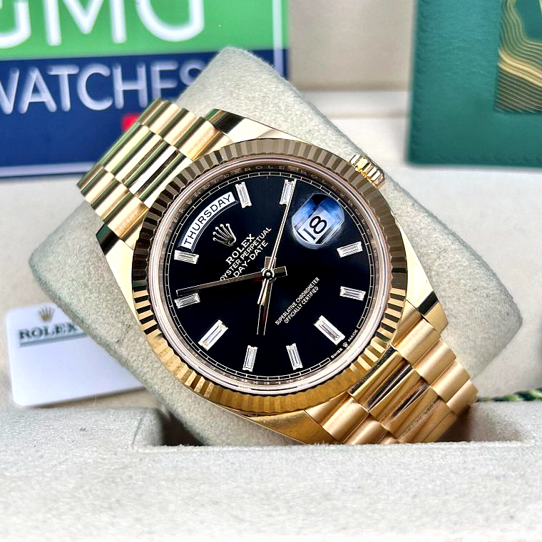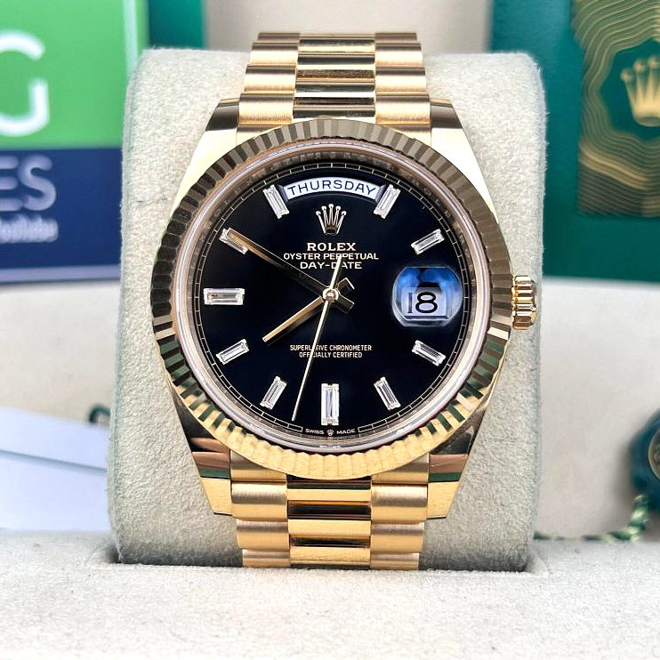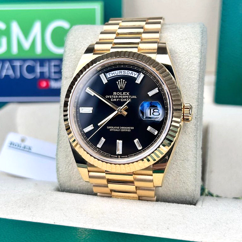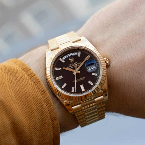 The Rolex fluted bezel is a mark of distinction. Originally, the fluting of the Oyster bezel had a functional purpose: it served to screw the bezel onto the case helping to ensure the waterproofness of the watch. It was therefore identical to the fluting on the case back, which was also screwed onto the case for waterproofness, using specific Rolex tools. Over time, the fluting became an aesthetic element, a genuine Rolex signature feature. Today the fluted bezel is a mark of distinction, in gold on this Day-Date 40.