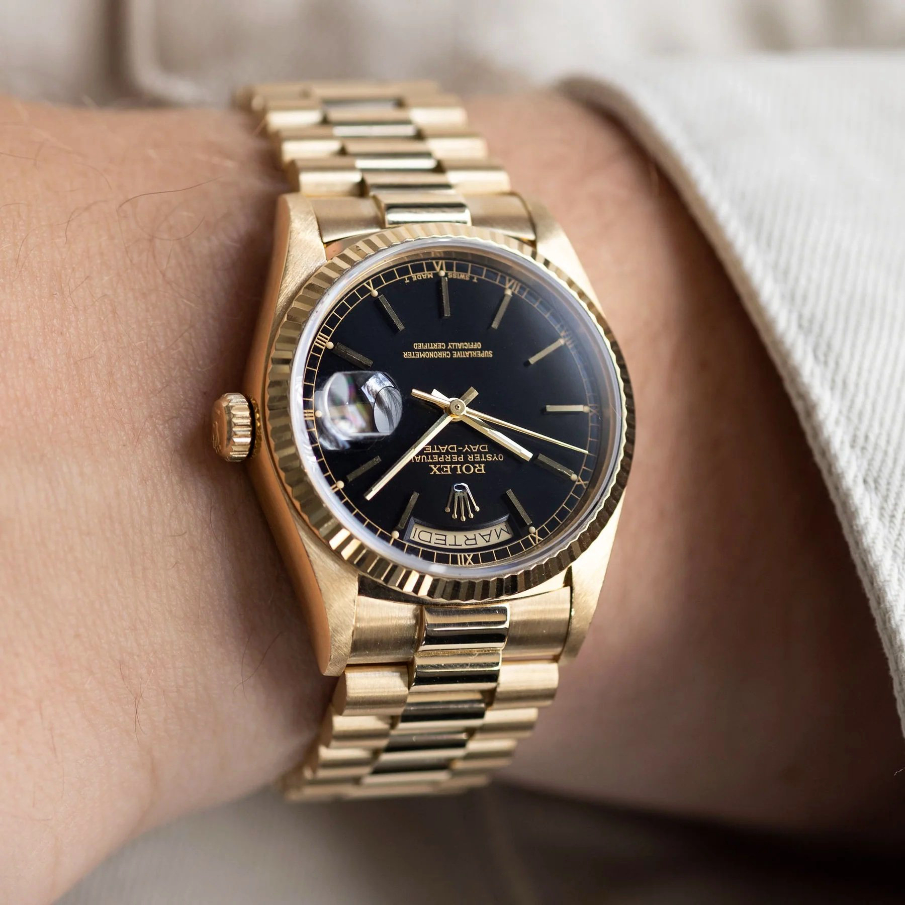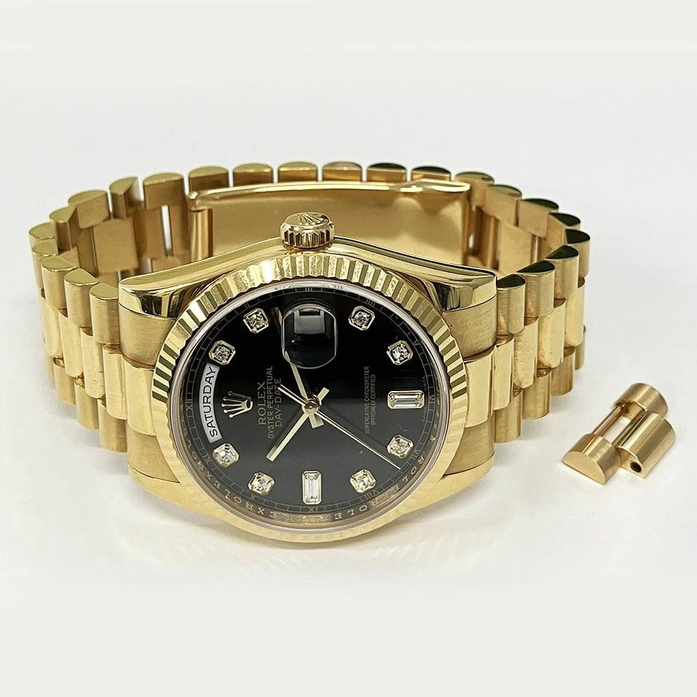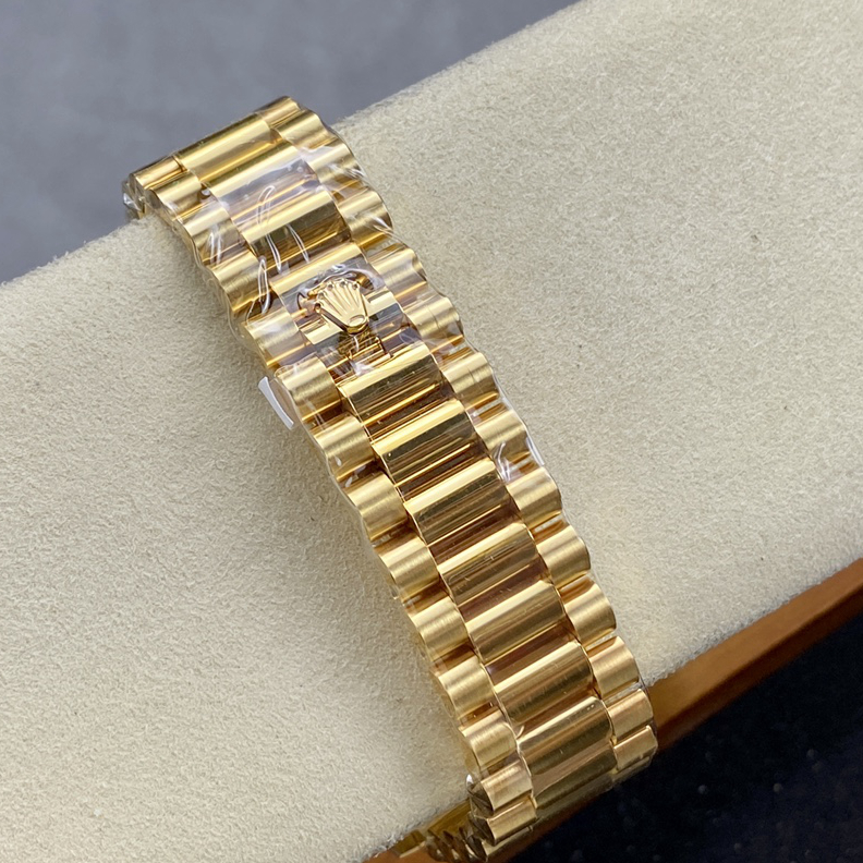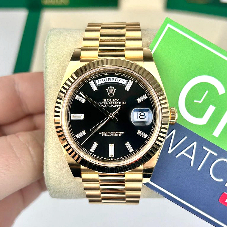 The Rolex fluted bezel is a mark of distinction. Originally, the fluting of the Oyster bezel had a functional purpose: it served to screw the bezel onto the case helping to ensure the waterproofness of the watch. It was therefore identical to the fluting on the case back, which was also screwed onto the case for waterproofness, using specific Rolex tools. Over time, the fluting became an aesthetic element, a genuine Rolex signature feature. Today the fluted bezel is a mark of distinction, in gold on this Day-Date 40.