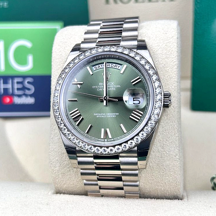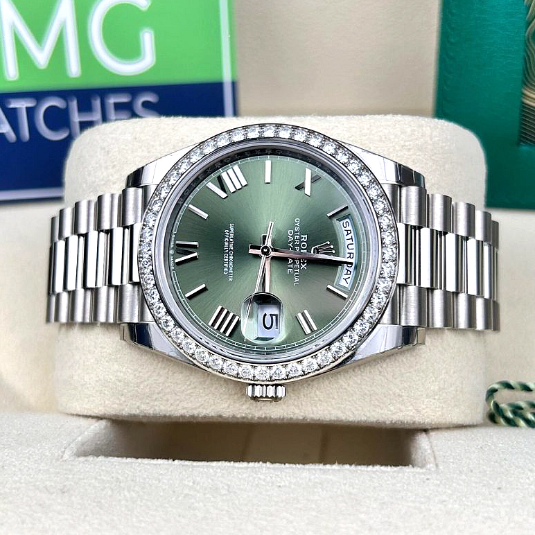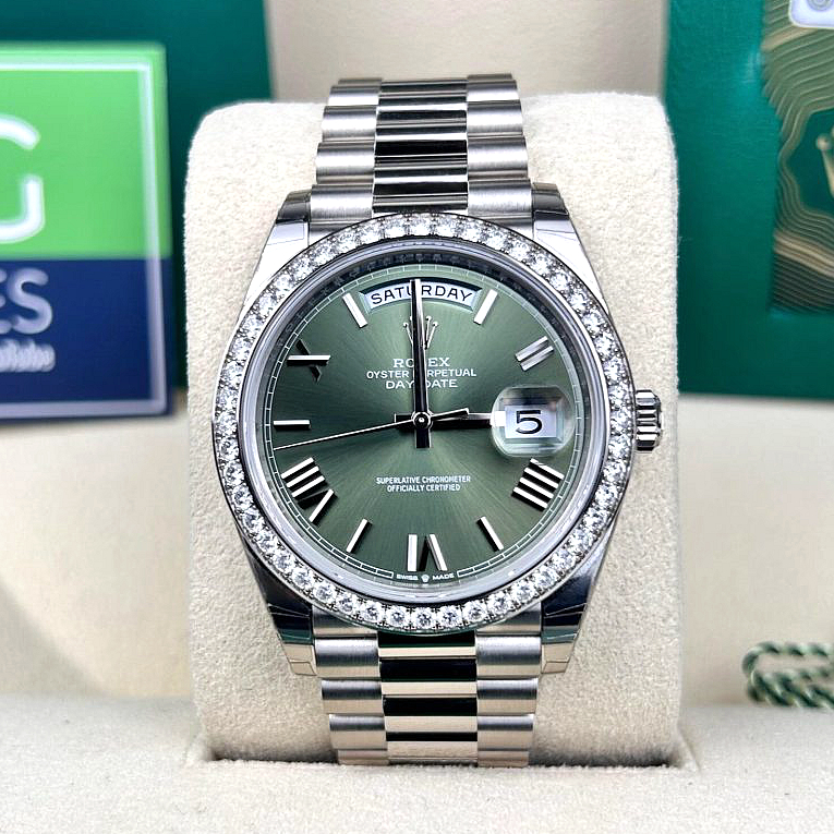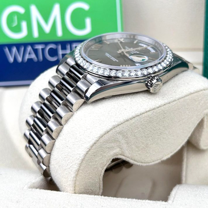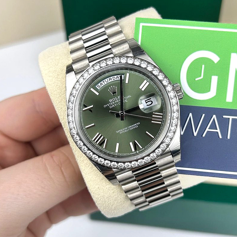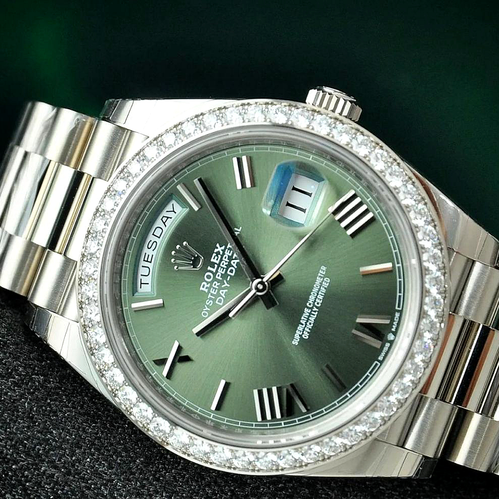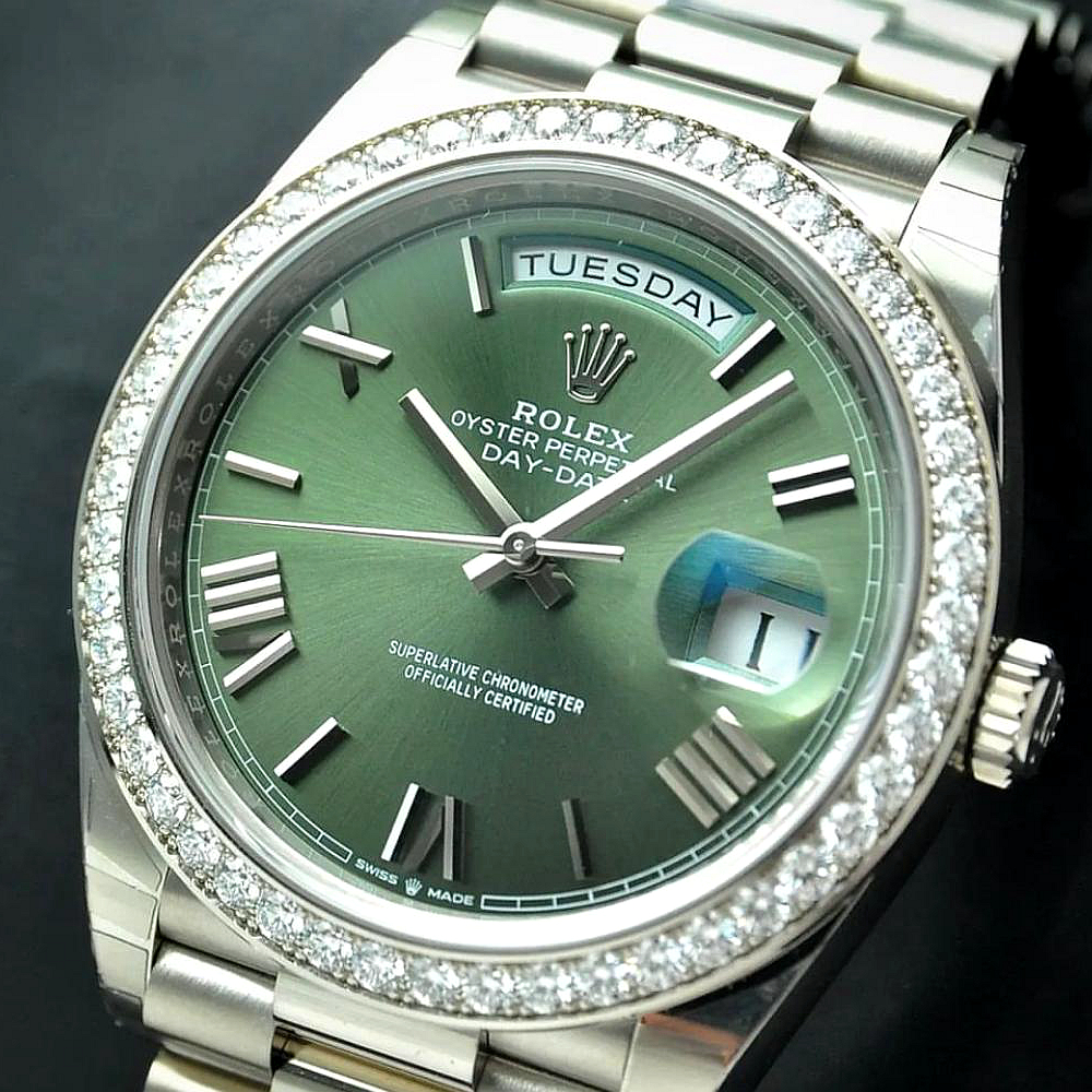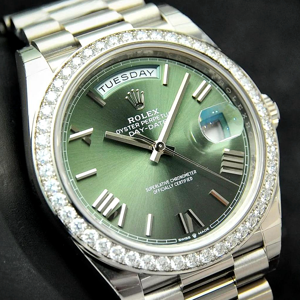 The Rolex fluted bezel is a mark of distinction. Originally, the fluting of the Oyster bezel had a functional purpose: it served to screw the bezel onto the case helping to ensure the waterproofness of the watch. It was therefore identical to the fluting on the case back, which was also screwed onto the case for waterproofness, using specific Rolex tools. Over time, the fluting became an aesthetic element, a genuine Rolex signature feature. Today the fluted bezel is a mark of distinction, in gold on this Day-Date 40.