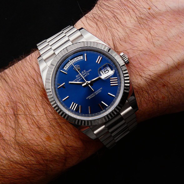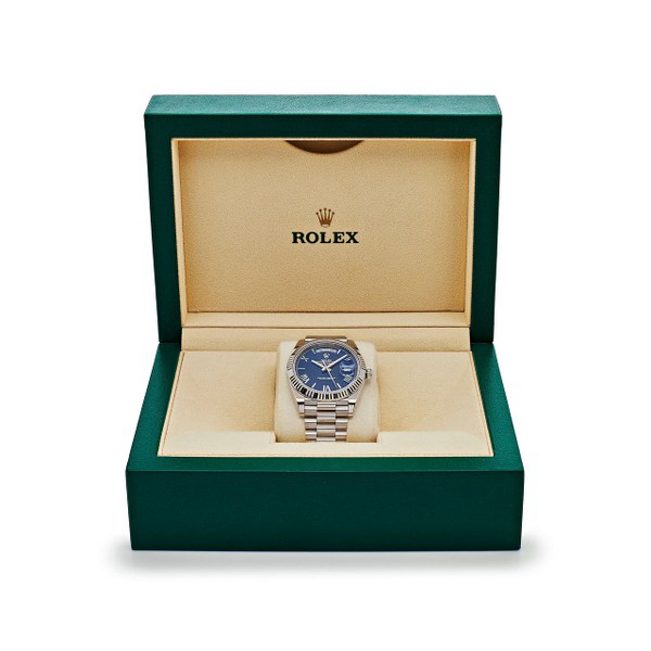 The Rolex fluted bezel is a mark of distinction. Originally, the fluting of the Oyster bezel had a functional purpose: it served to screw the bezel onto the case helping to ensure the waterproofness of the watch. It was therefore identical to the fluting on the case back, which was also screwed onto the case for waterproofness, using specific Rolex tools. Over time, the fluting became an aesthetic element, a genuine Rolex signature feature. Today the fluted bezel is a mark of distinction, in gold on this Day-Date 40.