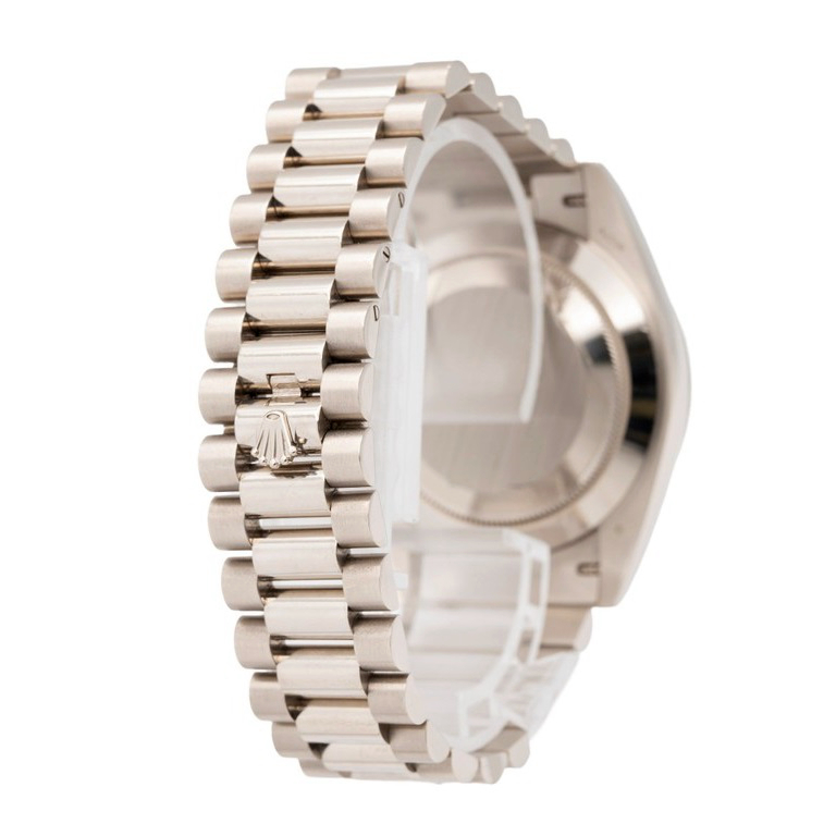 The Rolex fluted bezel is a mark of distinction. Originally, the fluting of the Oyster bezel had a functional purpose: it served to screw the bezel onto the case helping to ensure the waterproofness of the watch. It was therefore identical to the fluting on the case back, which was also screwed onto the case for waterproofness, using specific Rolex tools. Over time, the fluting became an aesthetic element, a genuine Rolex signature feature. Today the fluted bezel is a mark of distinction, in gold on this Day-Date 40.