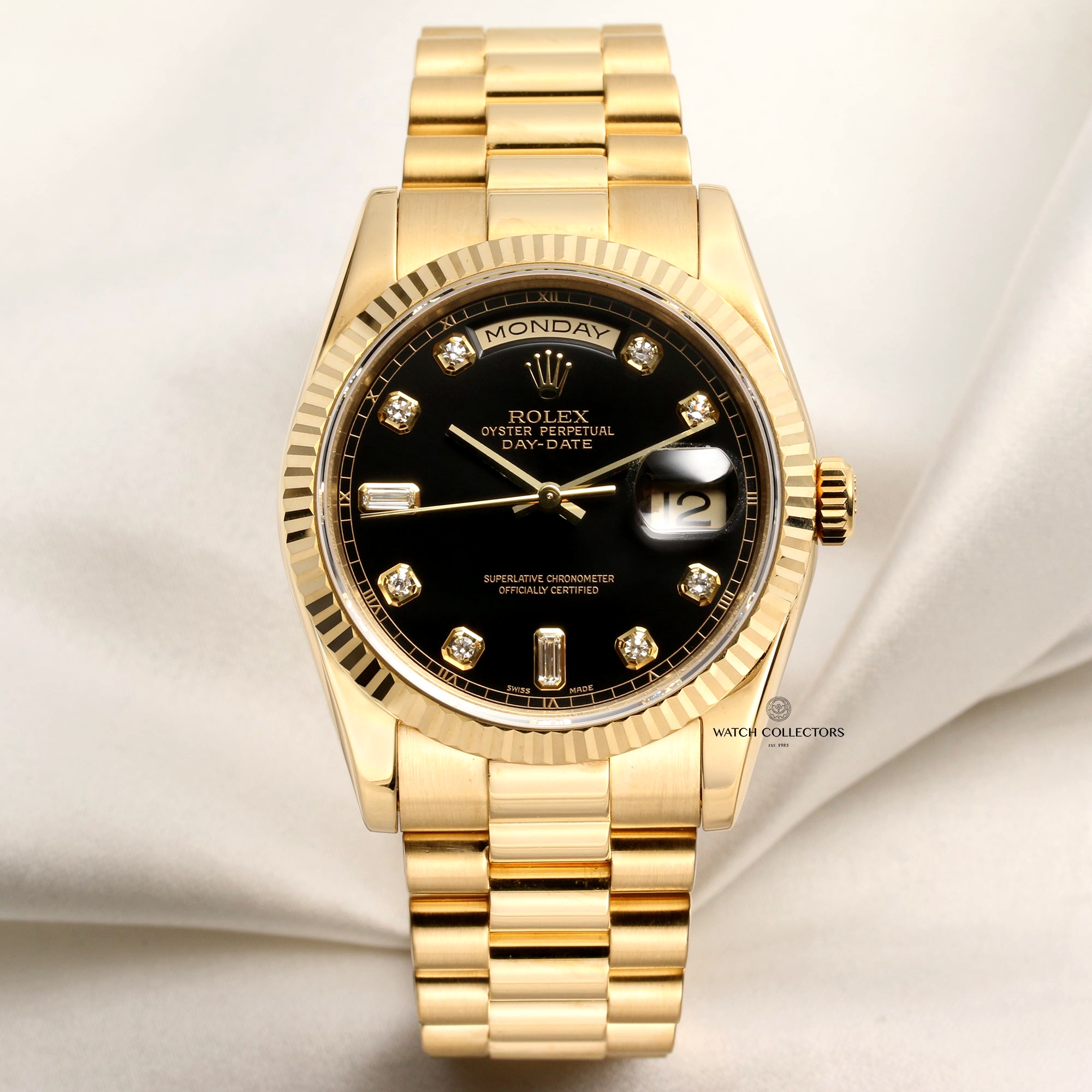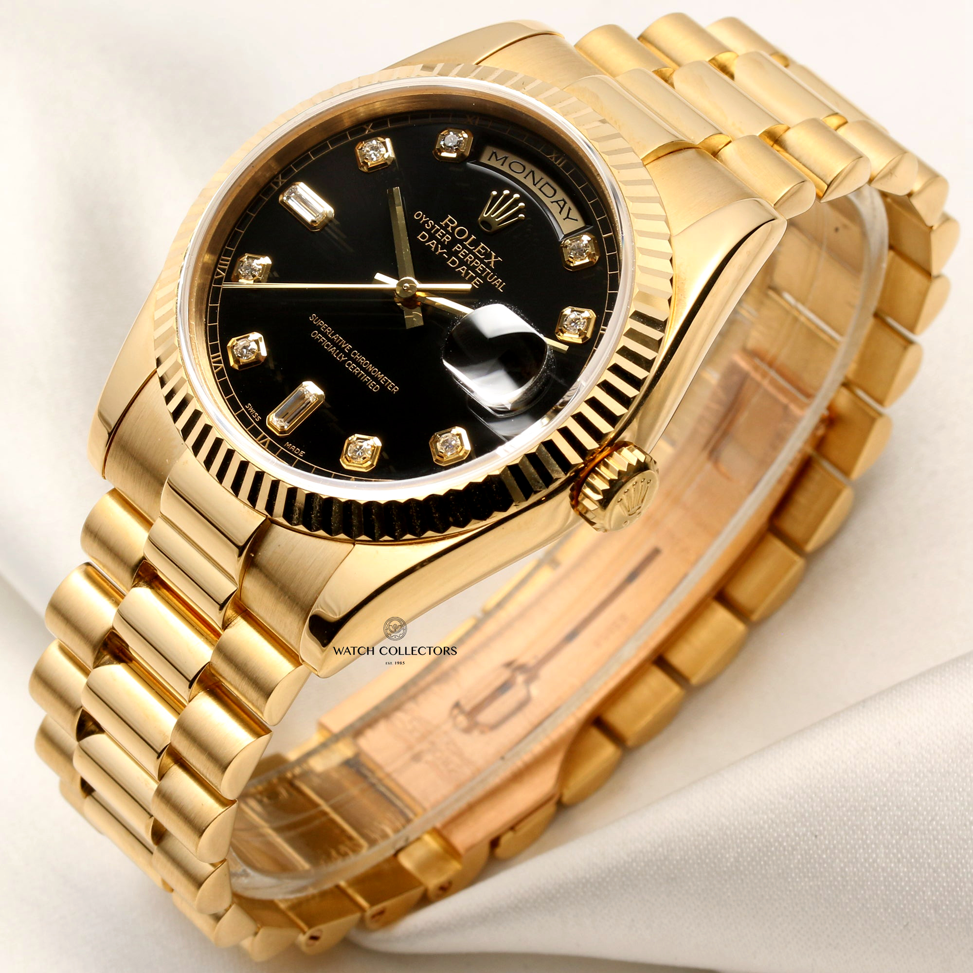 | Series | Rolex President Day Date Yellow Gold Black Diamond Dial Watch 118238 |