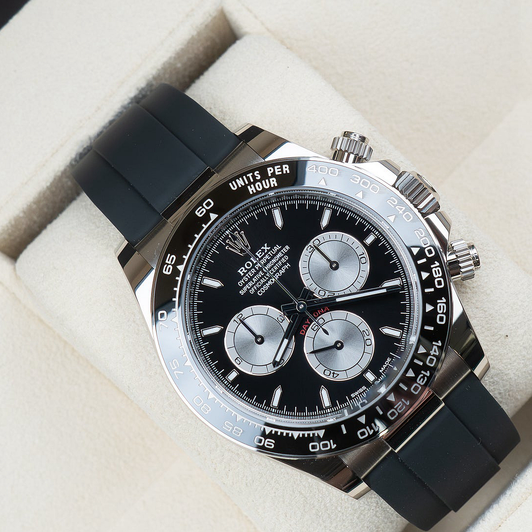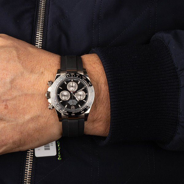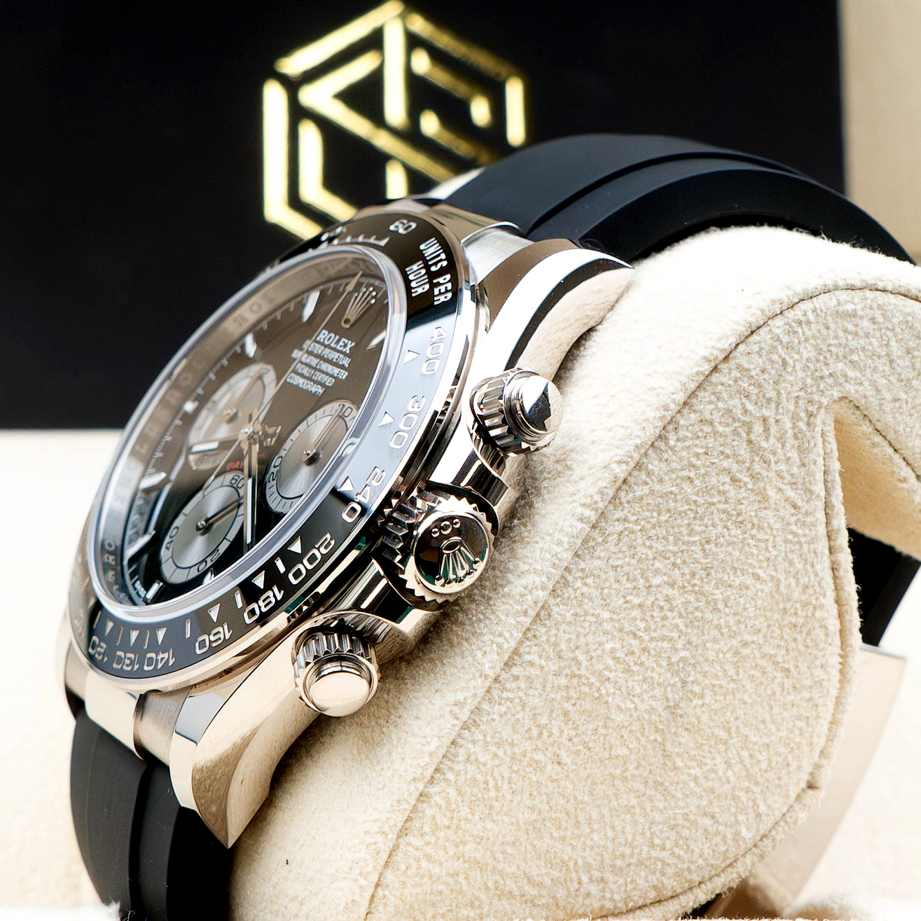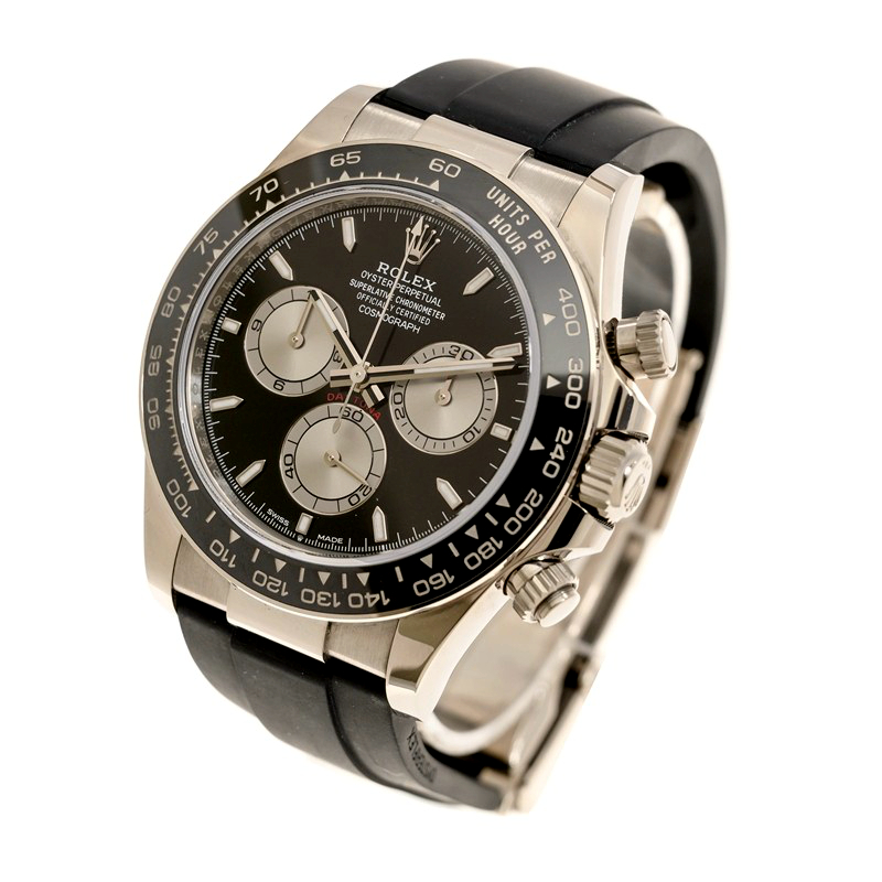 The case is crafted entirely from 18KT white gold with a high-polish finish. It has a black Oysterflex band with a solid 18KT white gold folding oysterlock buckle. This men's Rolex is the epitome of success and high-class. A gloss black dial with diamond hour markers and black/gold subdials offers a handsome contrast against the lustrous white gold finish. Despite its luxurious design, the Daytona is a racer’s watch through and through. The case is built tough, offering resistance to the extreme temperatures and shocks experienced while taking part in endurance races. The case also offers a Rolex calibre 4130 self-winding automatic COSC superlative chronometer certified perpetual movement, complete with anti-shock technology and stopwatch functions.