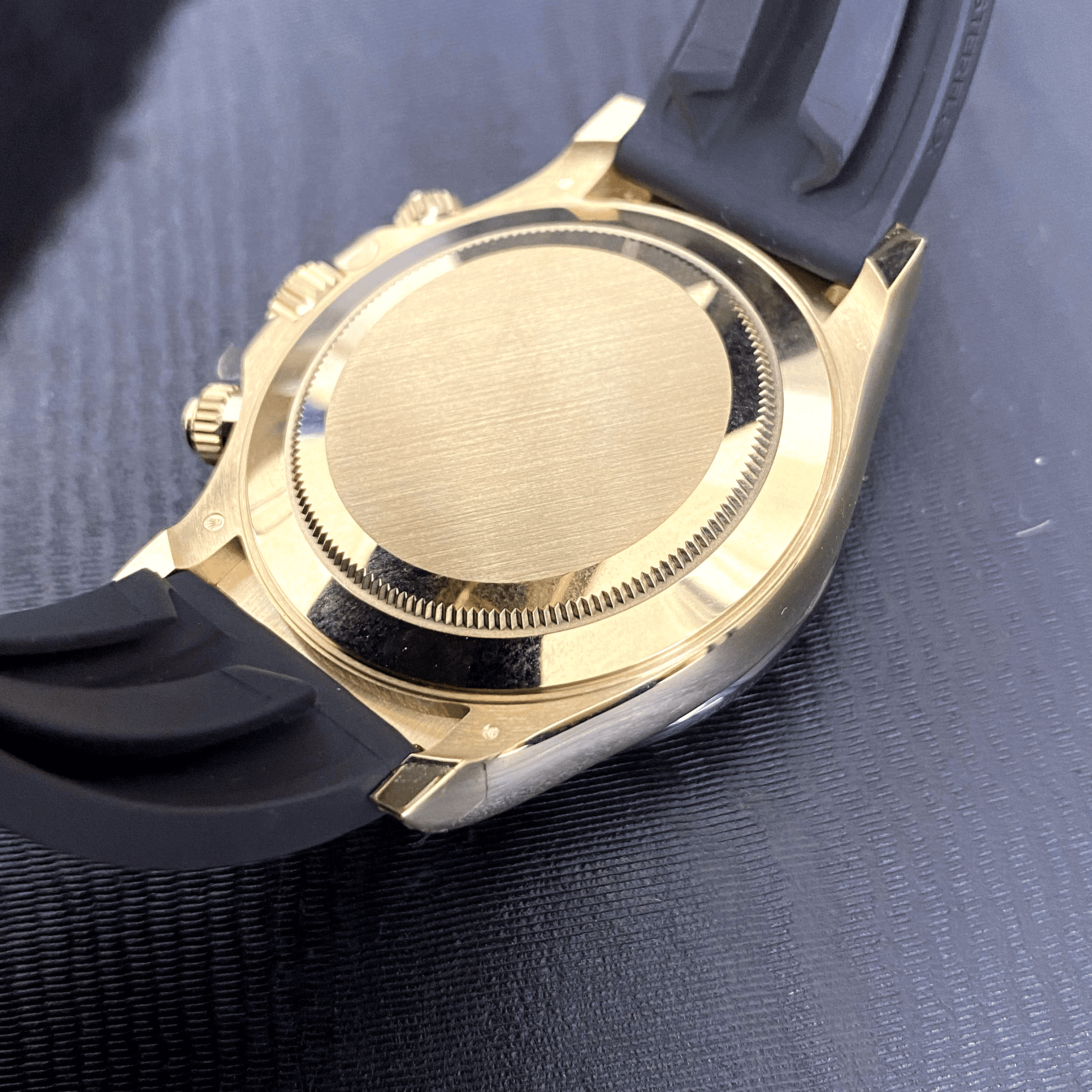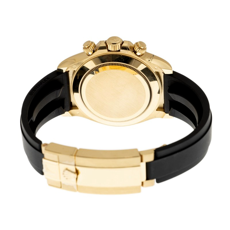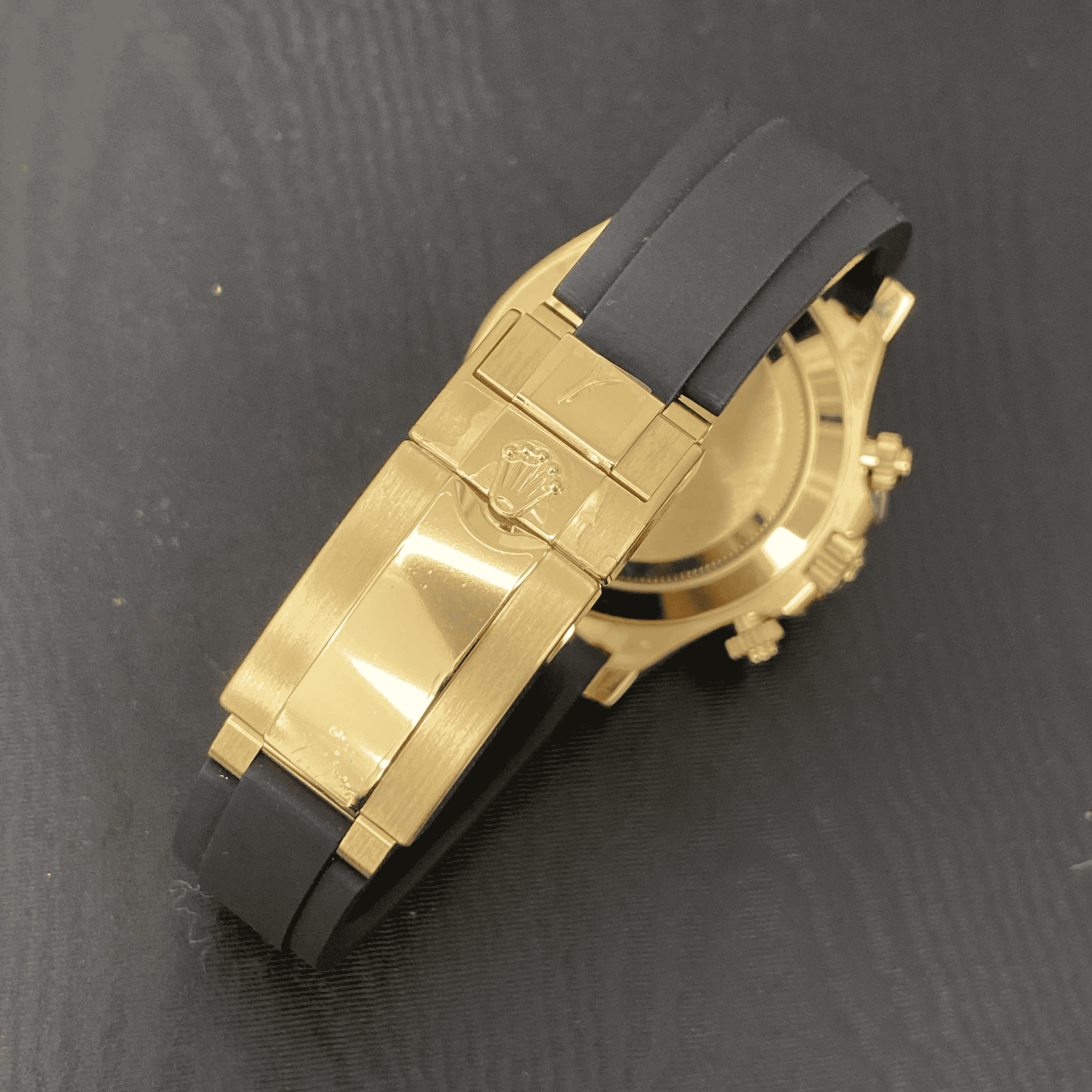 The case is crafted entirely from 18KT white gold with a high-polish finish. It has a black Oysterflex band with a solid 18KT white gold folding oysterlock buckle. This men's Rolex is the epitome of success and high-class. A gloss black dial with diamond hour markers and black/gold subdials offers a handsome contrast against the lustrous white gold finish. Despite its luxurious design, the Daytona is a racer’s watch through and through. The case is built tough, offering resistance to the extreme temperatures and shocks experienced while taking part in endurance races. The case also offers a Rolex calibre 4130 self-winding automatic COSC superlative chronometer certified perpetual movement, complete with anti-shock technology and stopwatch functions.