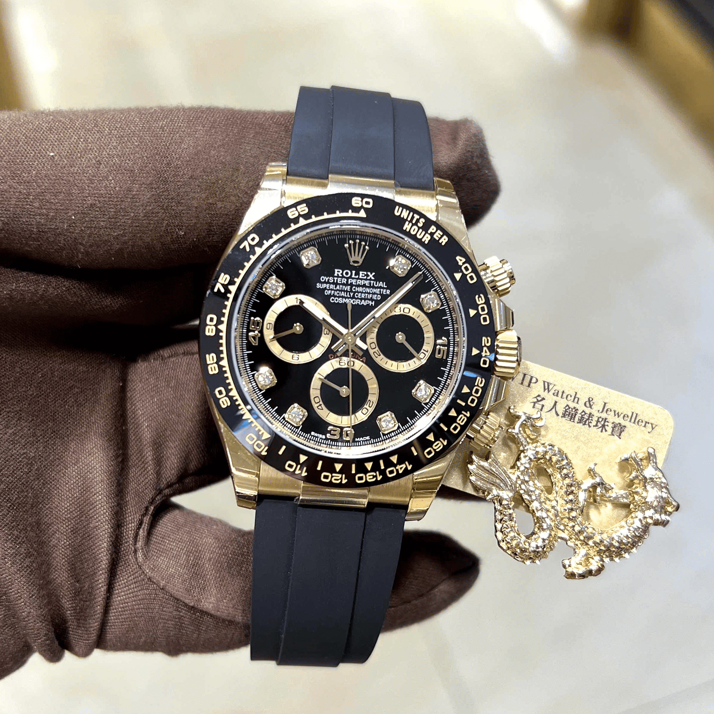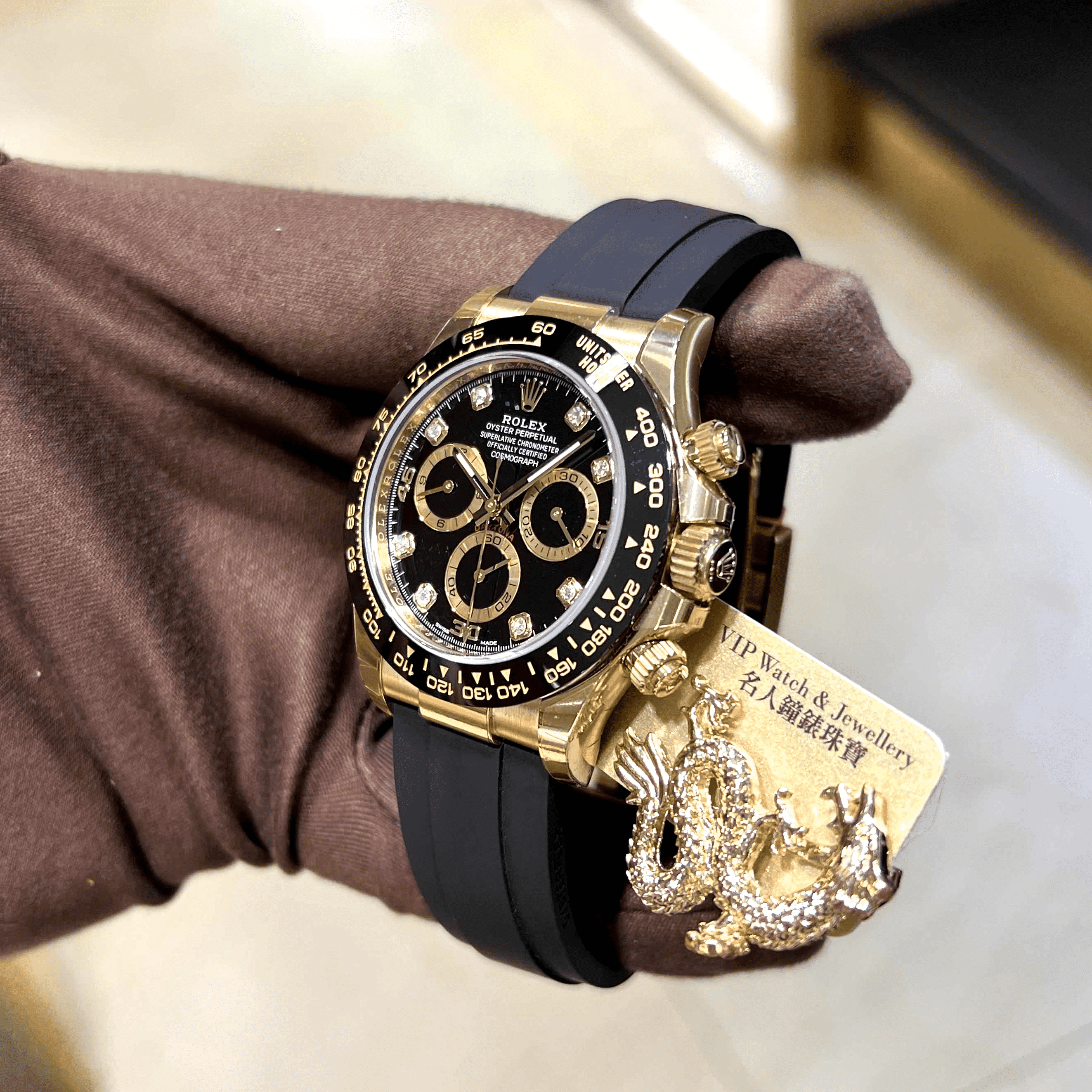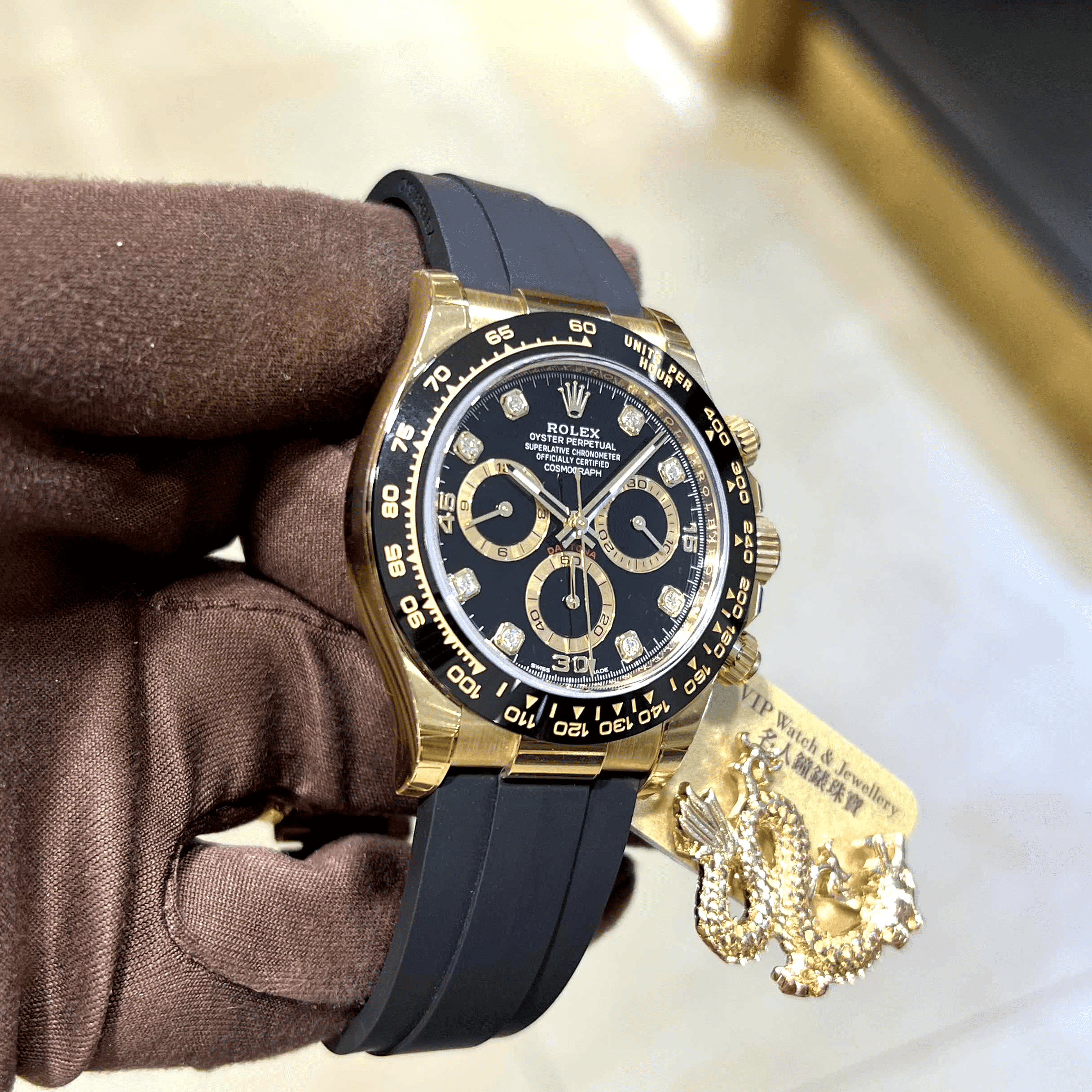 The case is crafted entirely from 18KT white gold with a high-polish finish. It has a black Oysterflex band with a solid 18KT white gold folding oysterlock buckle. This men's Rolex is the epitome of success and high-class. A gloss black dial with diamond hour markers and black/gold subdials offers a handsome contrast against the lustrous white gold finish. Despite its luxurious design, the Daytona is a racer’s watch through and through. The case is built tough, offering resistance to the extreme temperatures and shocks experienced while taking part in endurance races. The case also offers a Rolex calibre 4130 self-winding automatic COSC superlative chronometer certified perpetual movement, complete with anti-shock technology and stopwatch functions.