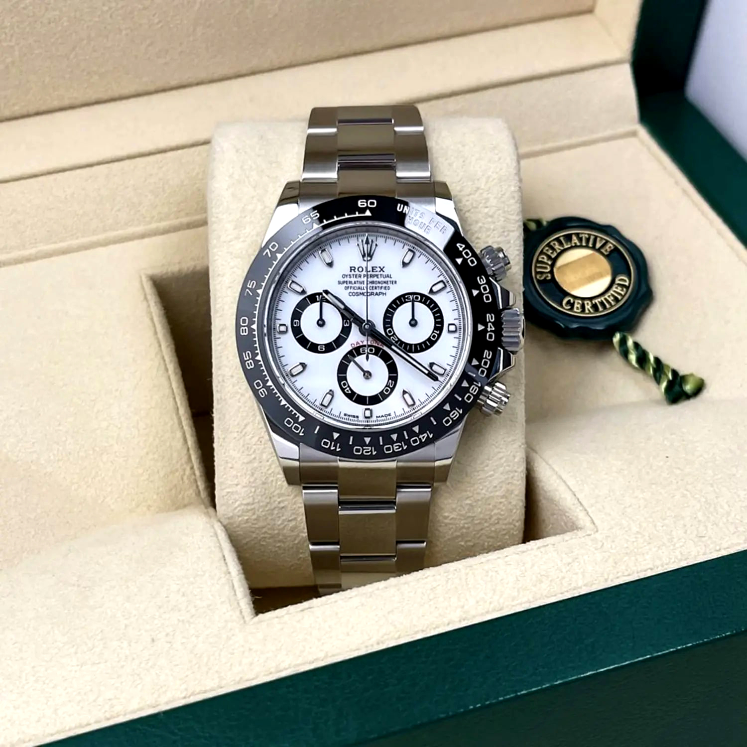 BEZEL : Black monobloc Cerachrom bezel in ceramic with moulded tachymetric scale