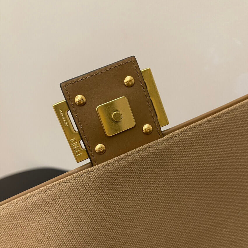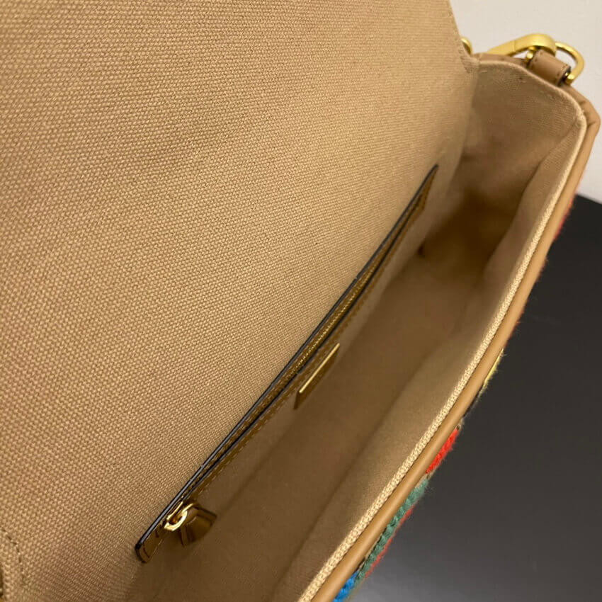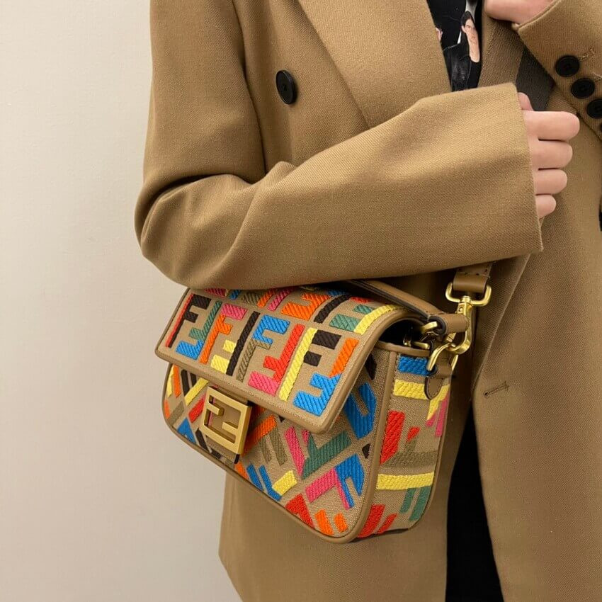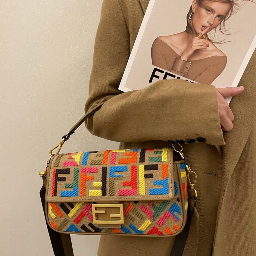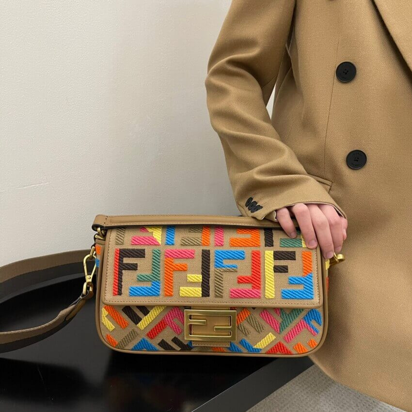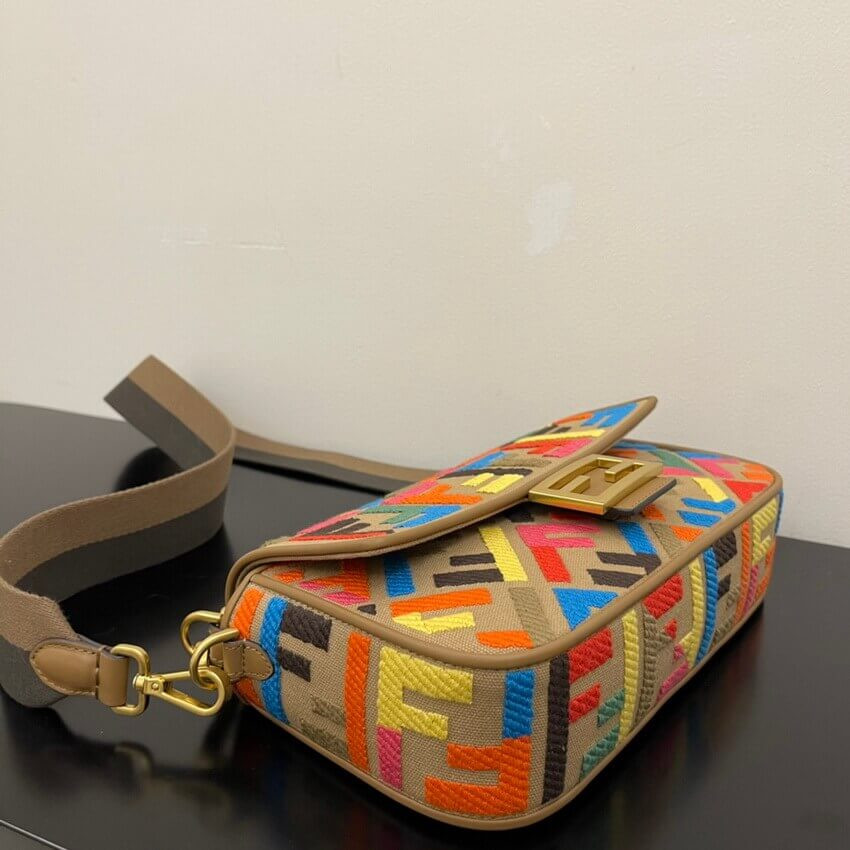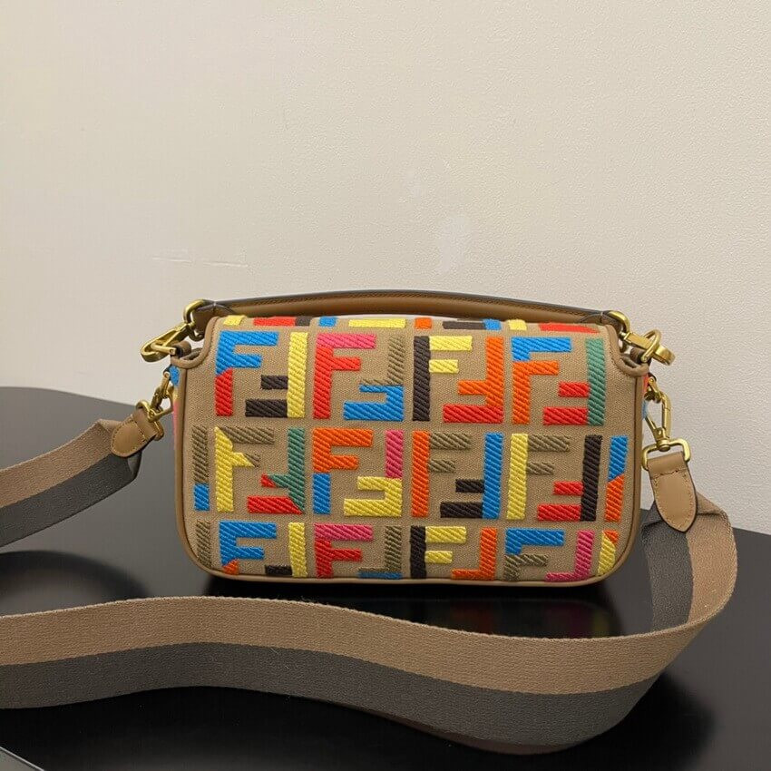 Iconic medium Baguette bag made of beige canvas with a multicolor raised embroidery FF motif, trimmed in tone on tone leather. Decorated with an FF clasp.