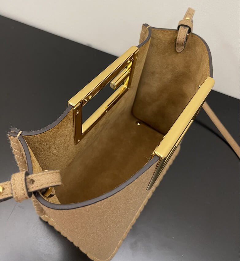 Small Fendi Way bag made of beige flannel with oversized FF logo metal handles.