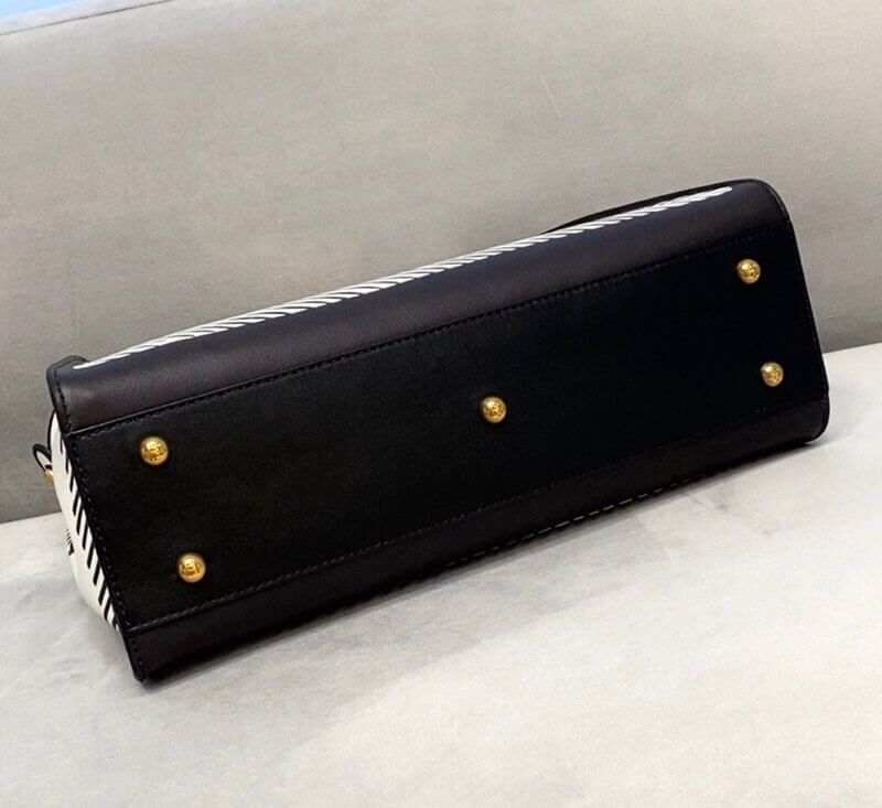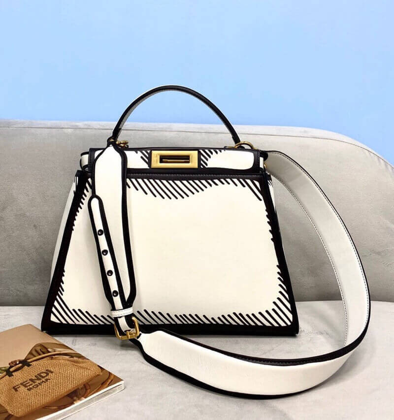 Medium iconic Peekaboo bag, made of white leather decorated with edges and details marked by a contrasting black graphic outline that creates a two-dimensional effect, and with the classic twist lock on both sides.