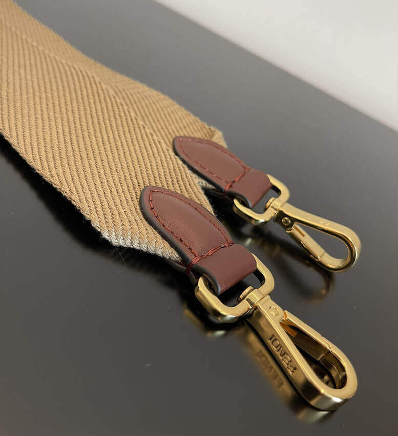 Large Sunshine shopper made of beige canvas, featuring tone on tone embossed “FENDI ROMA” embroidery and stiff leather handles.