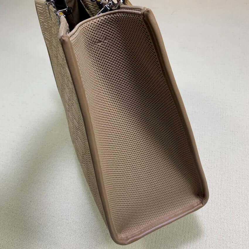 Medium Sunshine Shopper bag made of beige technical mesh with 3D texture FF motif and stiff tortoiseshell plexiglass effect handles.