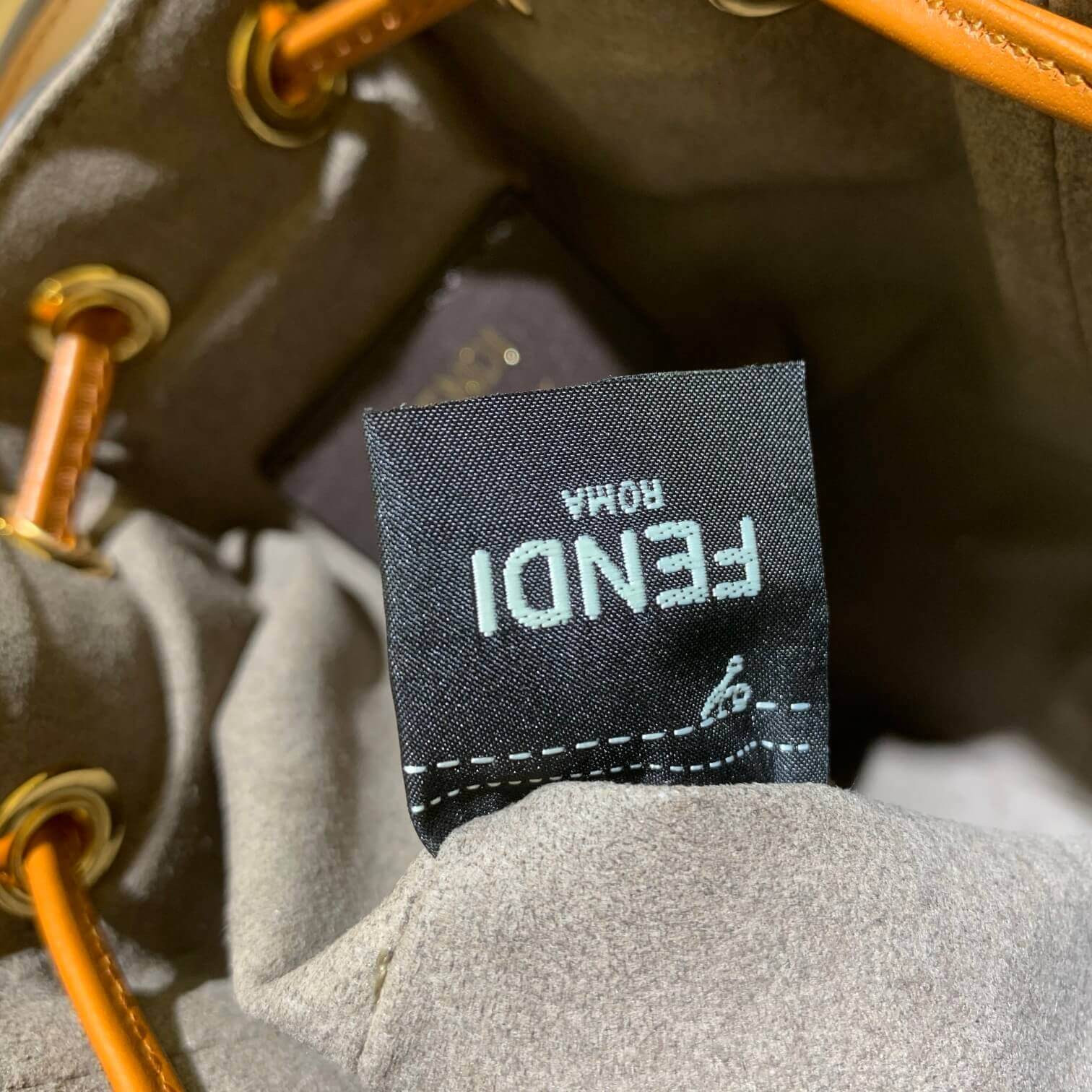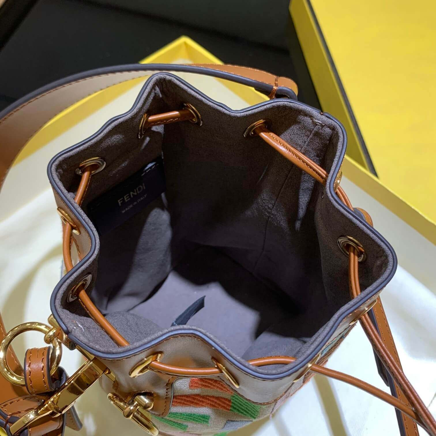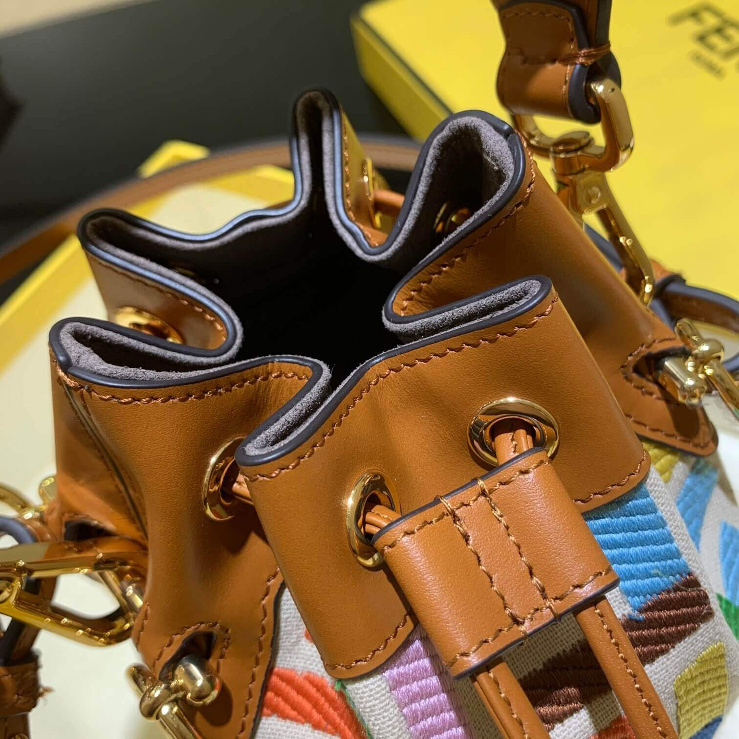 Small Mon Tresor bucket bag with drawstring fastening and metal decorations in the Fendi logo shape. Two detachable shoulder straps, one long and one short, to wear the bag over the shoulder or cross-body. Made of beige canvas. Finished with FF motif embroidered in multicolor thread. Details in brown leather. Gold-finish metalware.