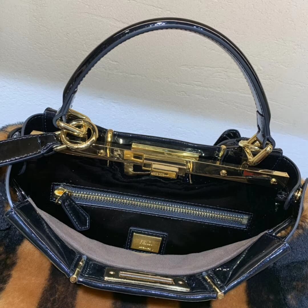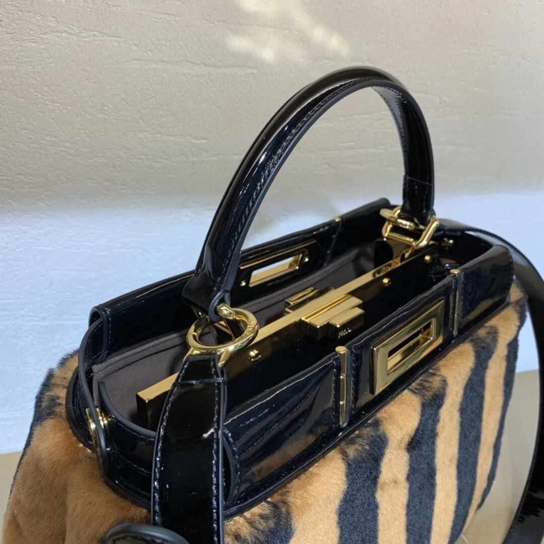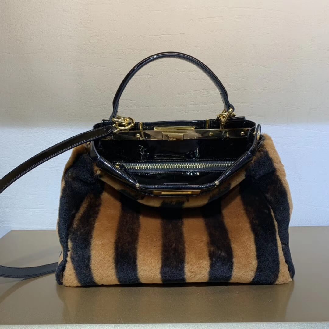 Medium handbag made with two compartments divided by a stiff partition. Twist lock on both sides. Lining with zip pocket. Single handle and an adjustable, detachable shoulder strap. Made of Pequin-striped brown and black sheepskin. Black vinyl details. Gold-finish metalware.