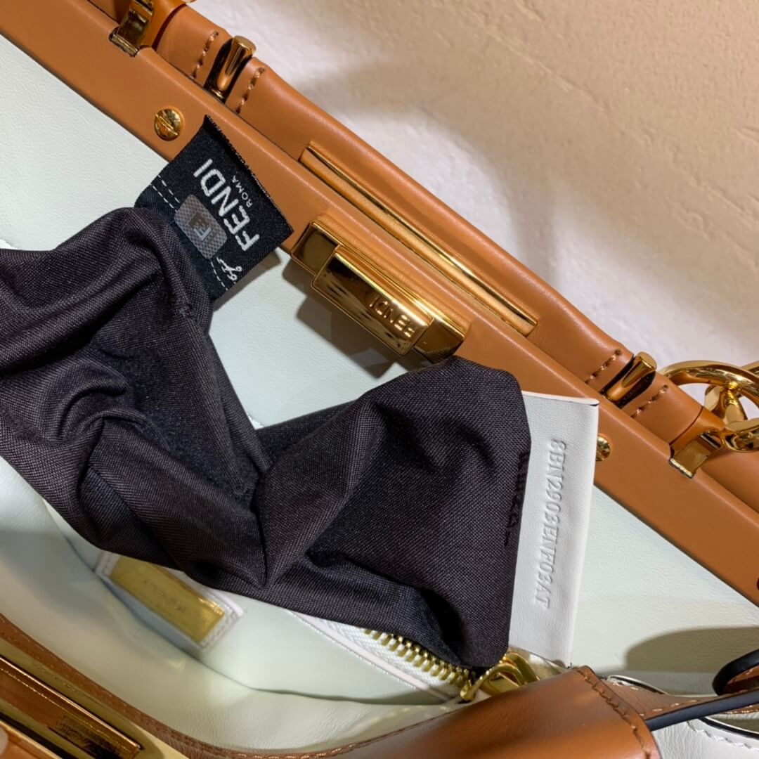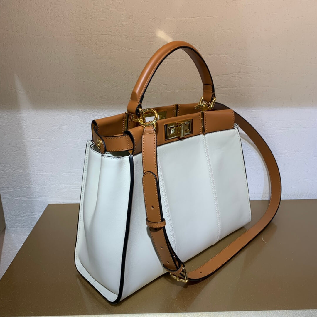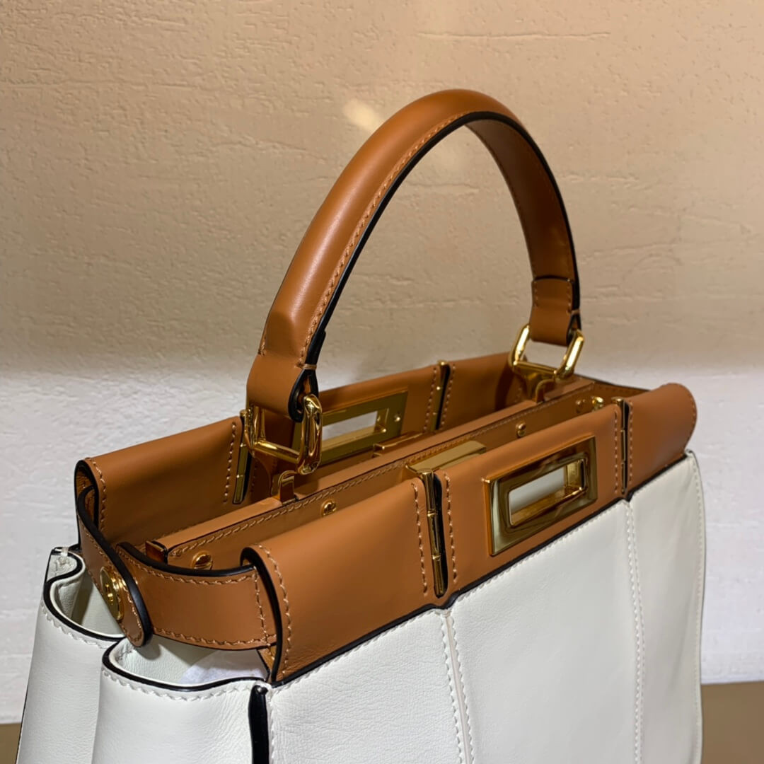 Medium handbag made with 2 compartments divided by a stiff partition. Twist lock on both sides. Lining with zippered pocket. Single handle and an adjustable, detachable shoulder strap. Made of whitecalfskin. Two-tone contrasting details. Gold-finish metalware.