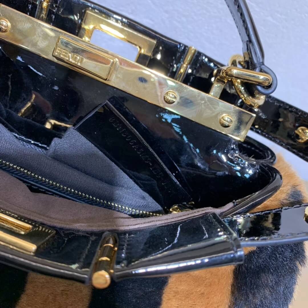 Small handbag made with two compartments divided by a stiff partition. Twist lock on both sides. Lining with zip pocket. Single handle and thin, adjustable, detachable cross-body strap. Made of black mink. Finished with Pequin motif inlaid in shades of brown and black. Details and lining in dark brown nappa leather. Gold-finish metalware.