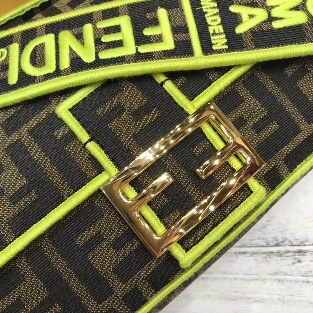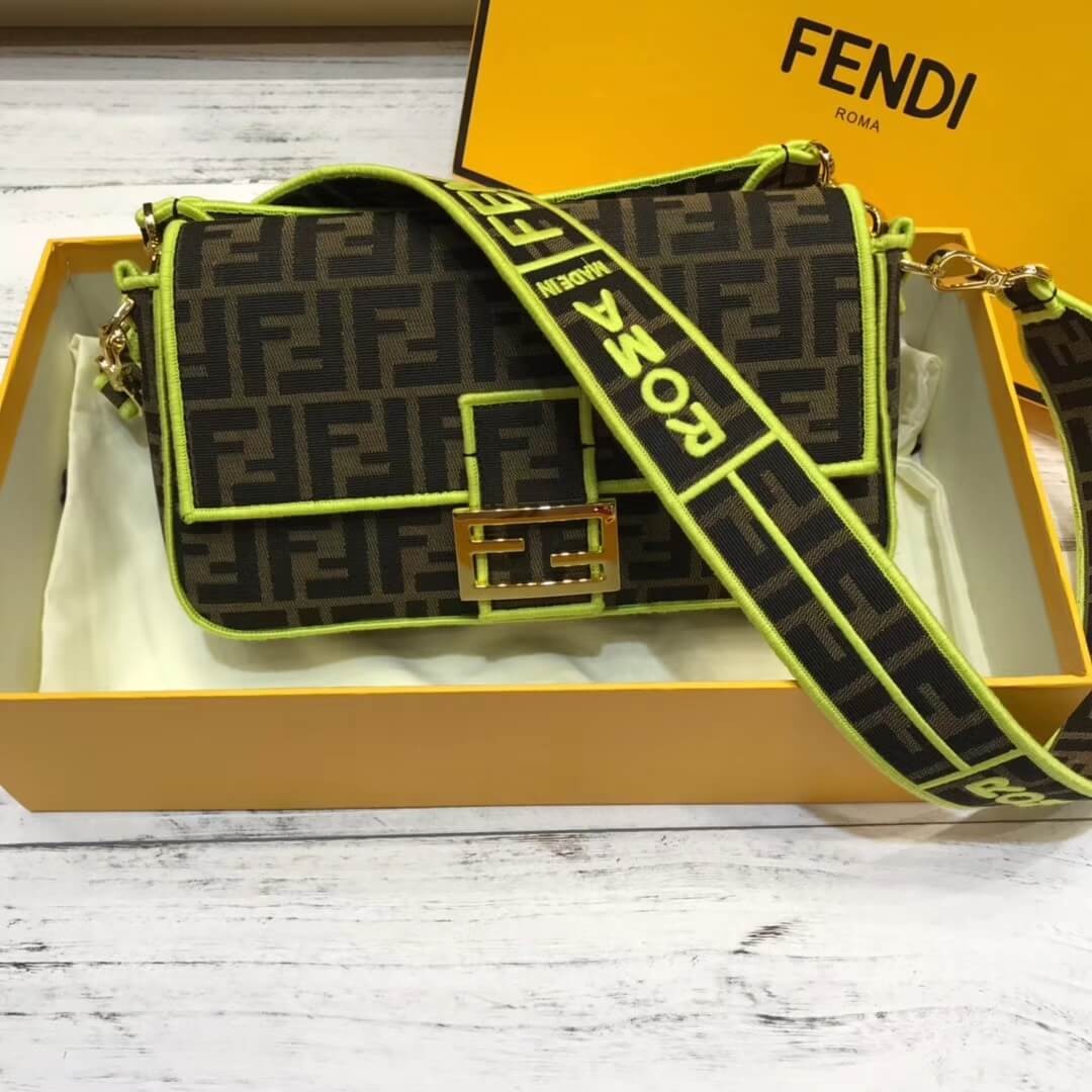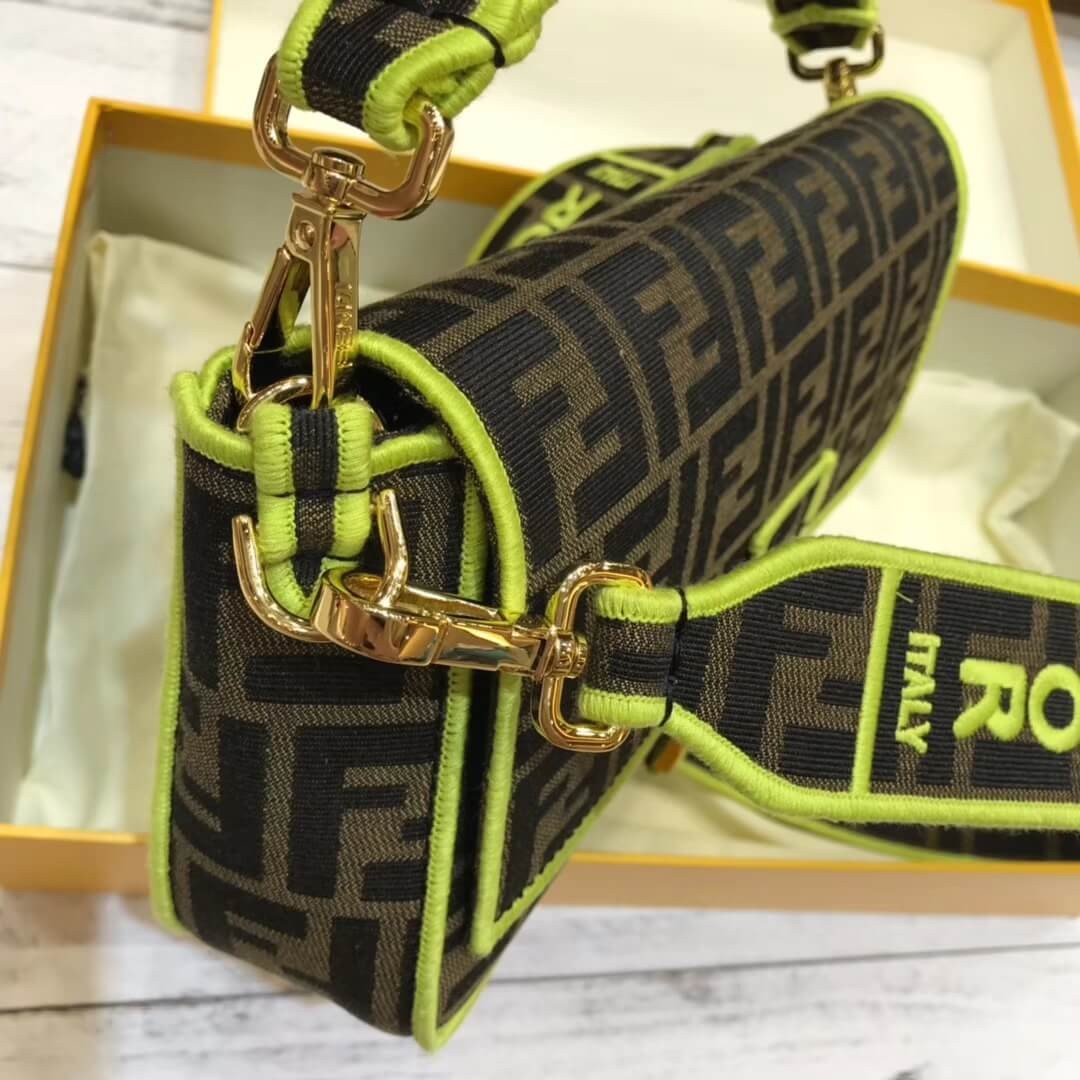 Iconic shoulder bag with flap and magnetic button clasp. Lining with zip pocket. Removable fabric shoulder strap with Jacquard FF motif. Finished with satin stitched embroidered profiles in fluorescent fuchsia tones. Customised shoulder strap with Fendi Label motif in the same tones. Gold-finish metalware.