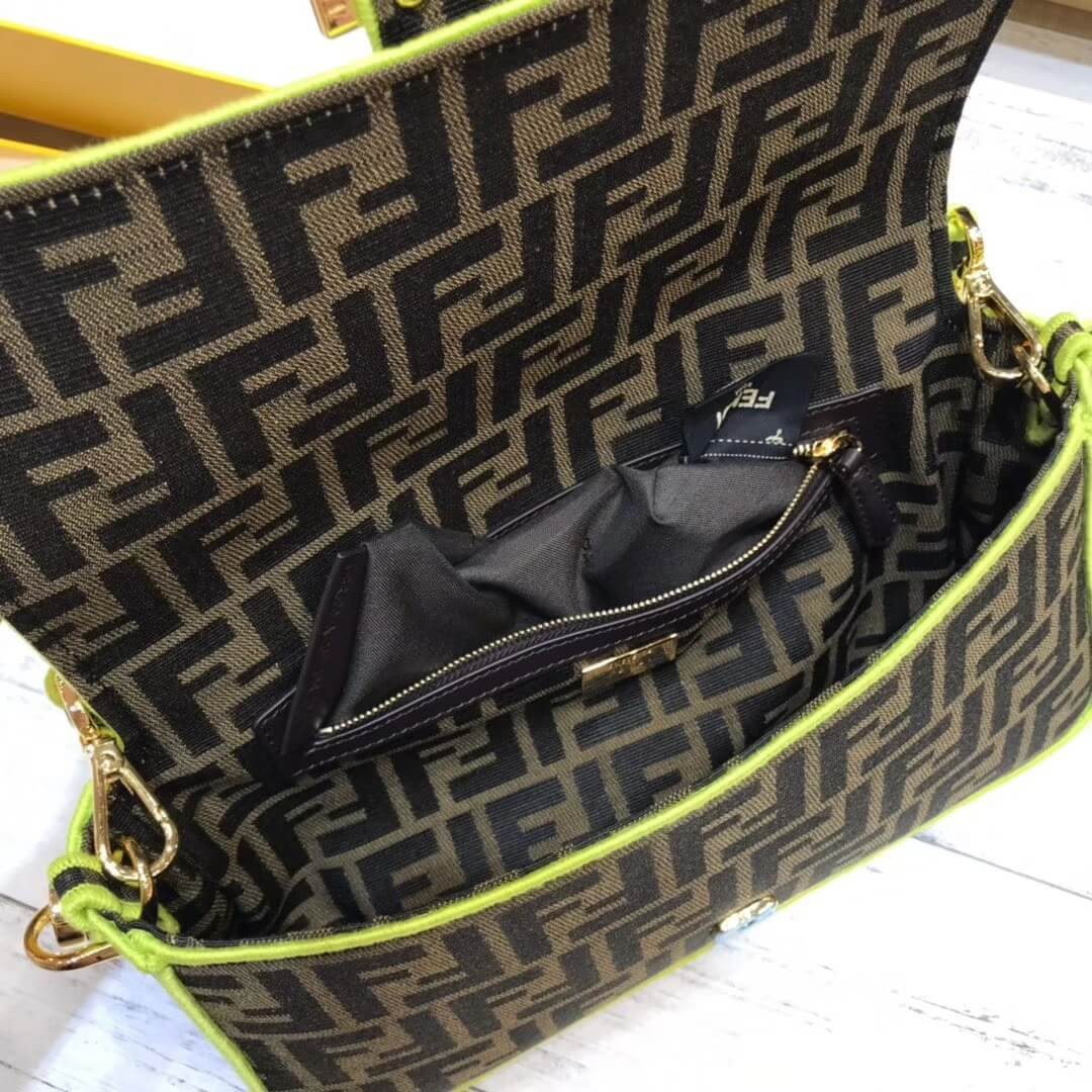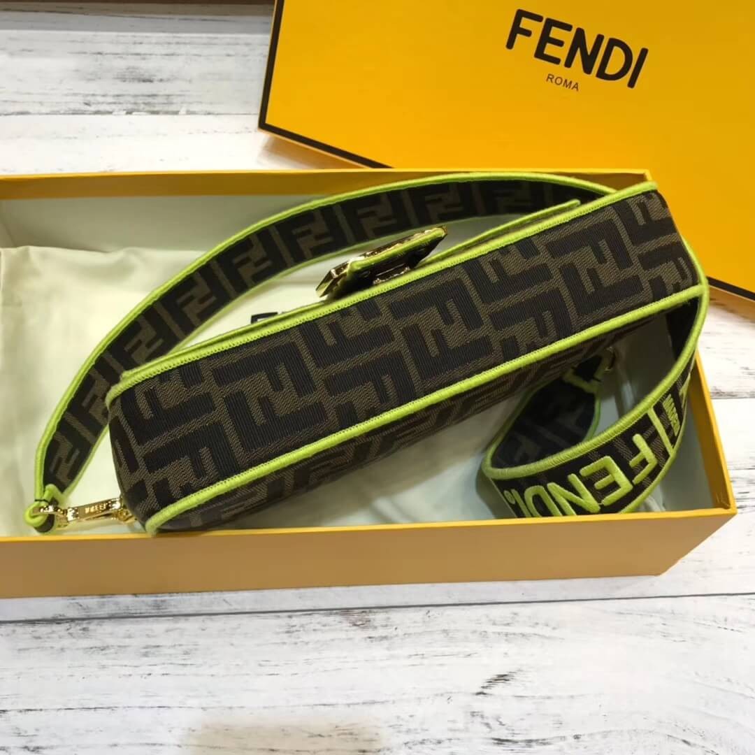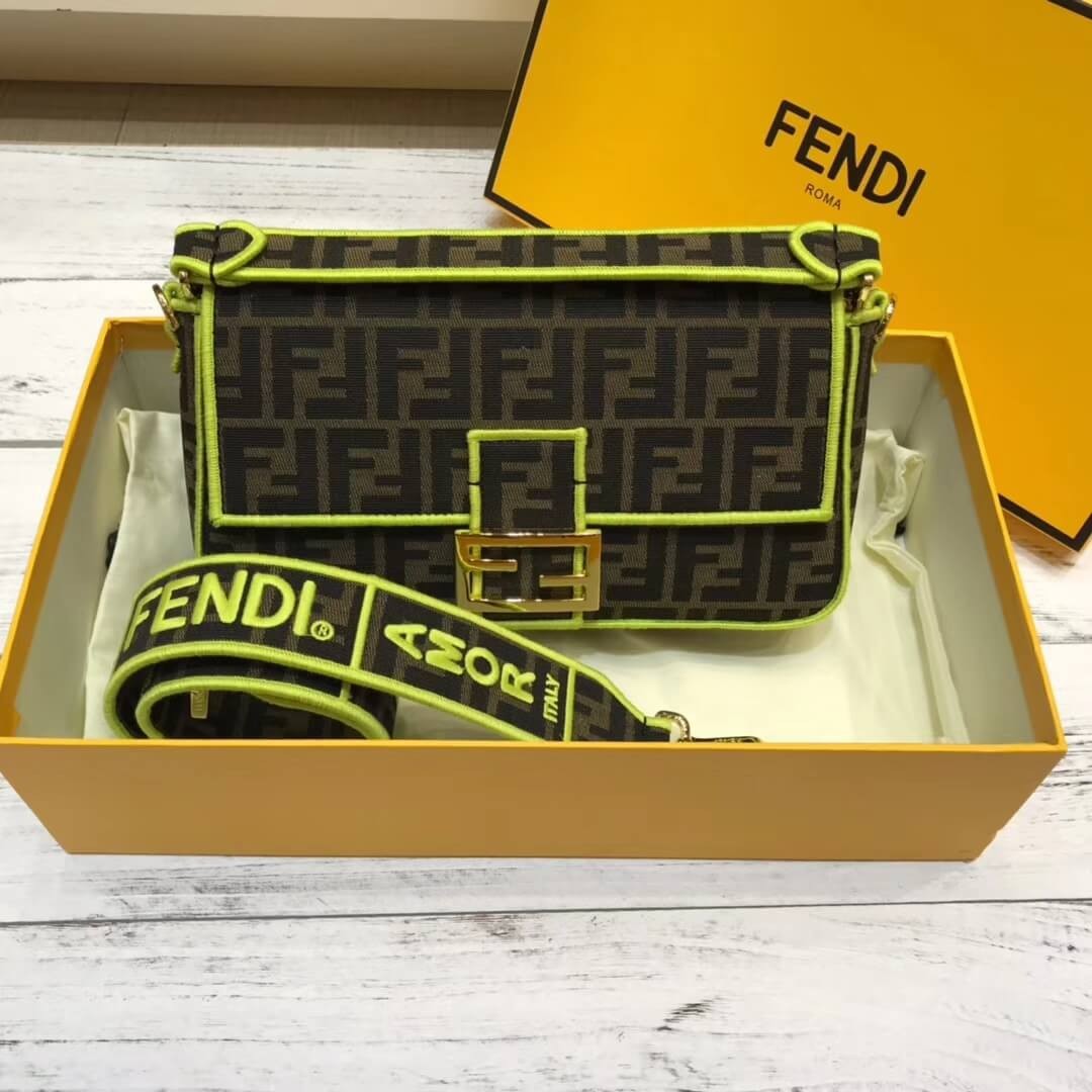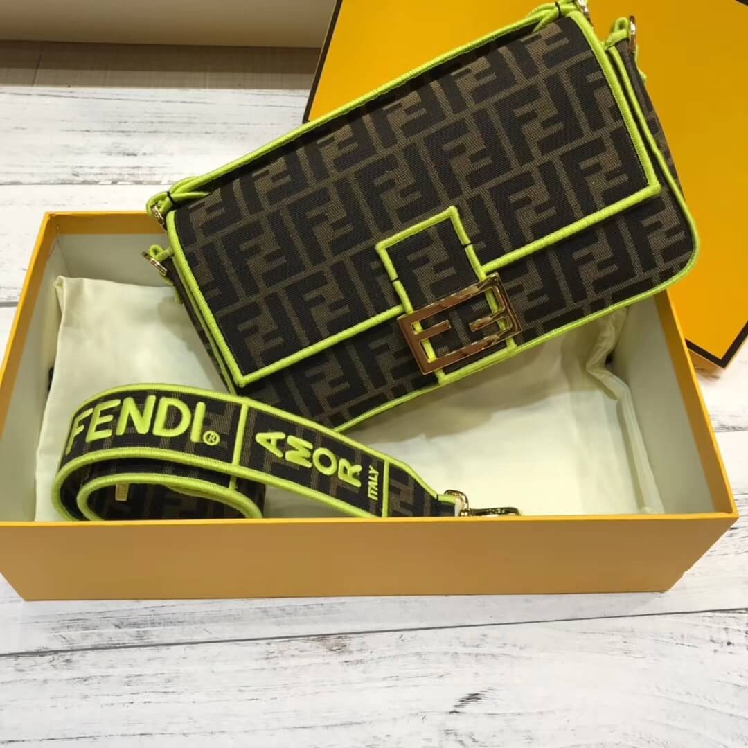 Iconic shoulder bag with flap and magnetic button clasp. Lining with zip pocket. Removable fabric shoulder strap with Jacquard FF motif. Finished with satin stitched embroidered profiles in fluorescent fuchsia tones. Customised shoulder strap with Fendi Label motif in the same tones. Gold-finish metalware.