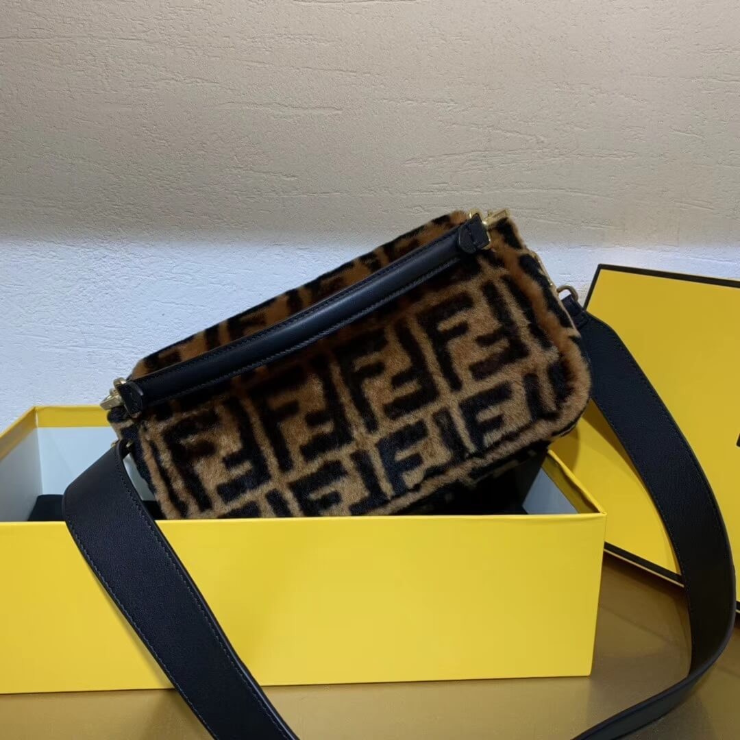 Iconic shoulder bag with flap and magnetic button clasp. Lining with zip pocket. Made of sheepskin with macro FF motif printed in brown and black. Style has both a short and long shoulder strap that are detachable. Gold-finish metalware.