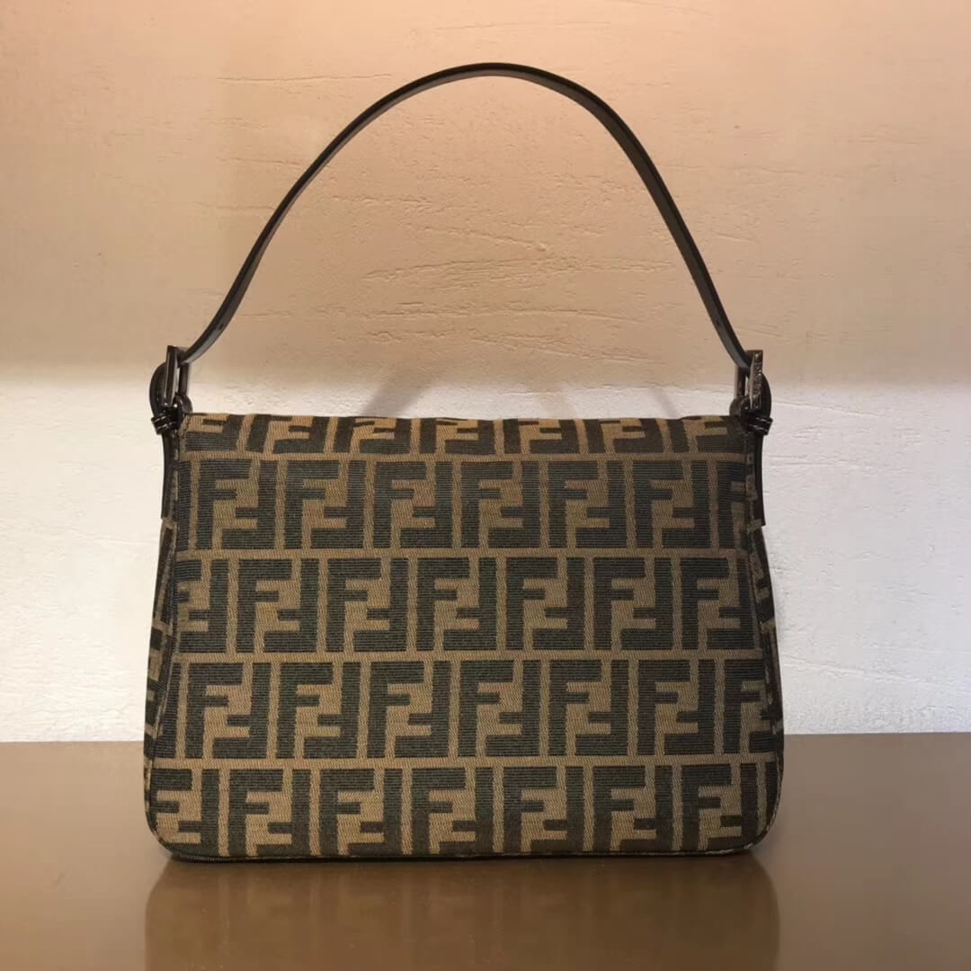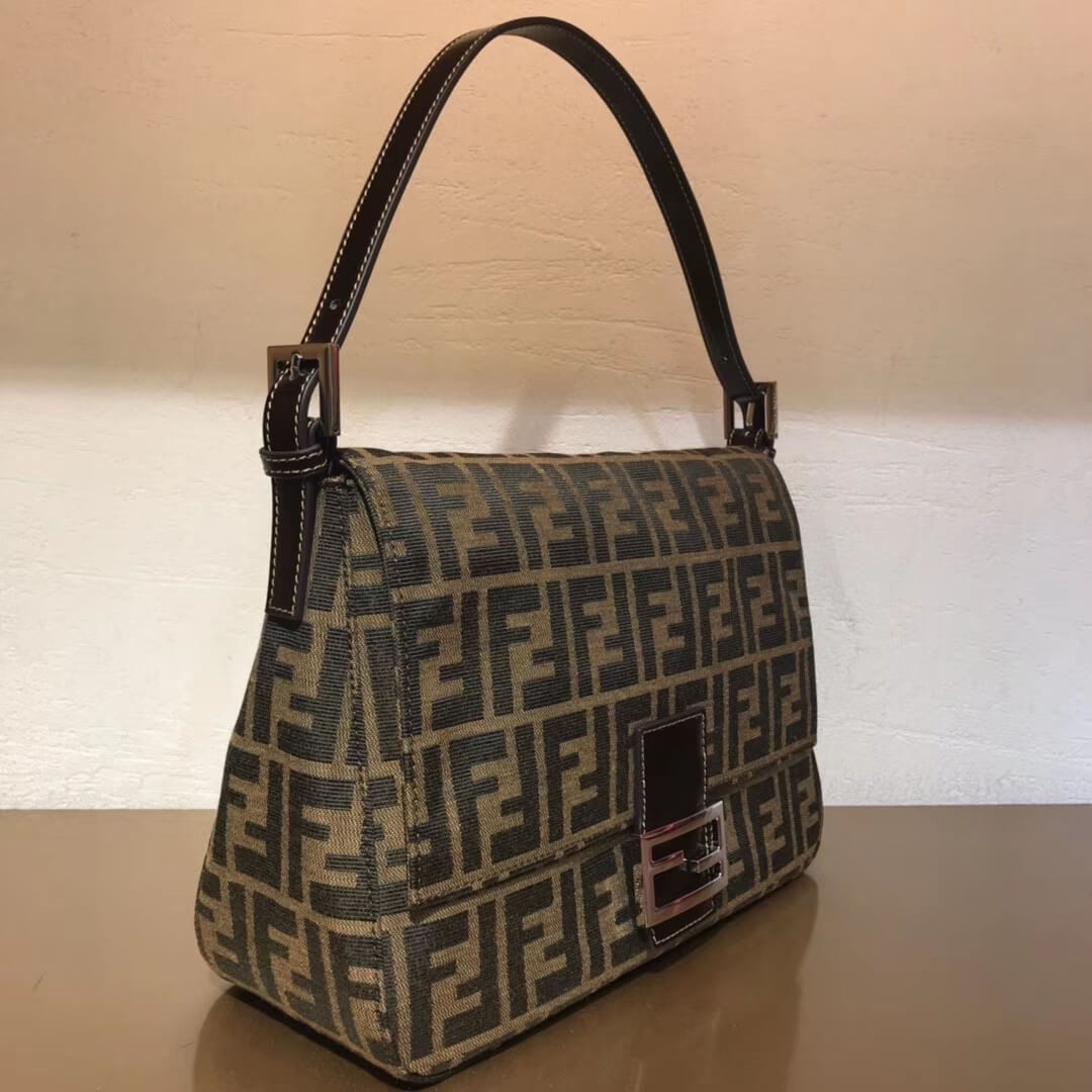 Brown and black canvas and leather Mamma Baguette Zucca Shoulder Bag from Fendi Vintage.