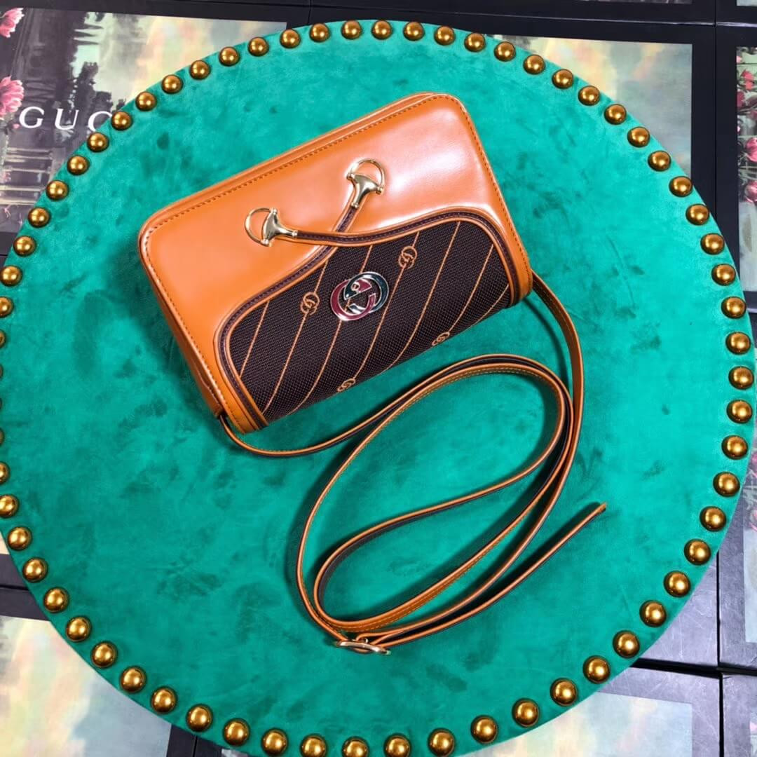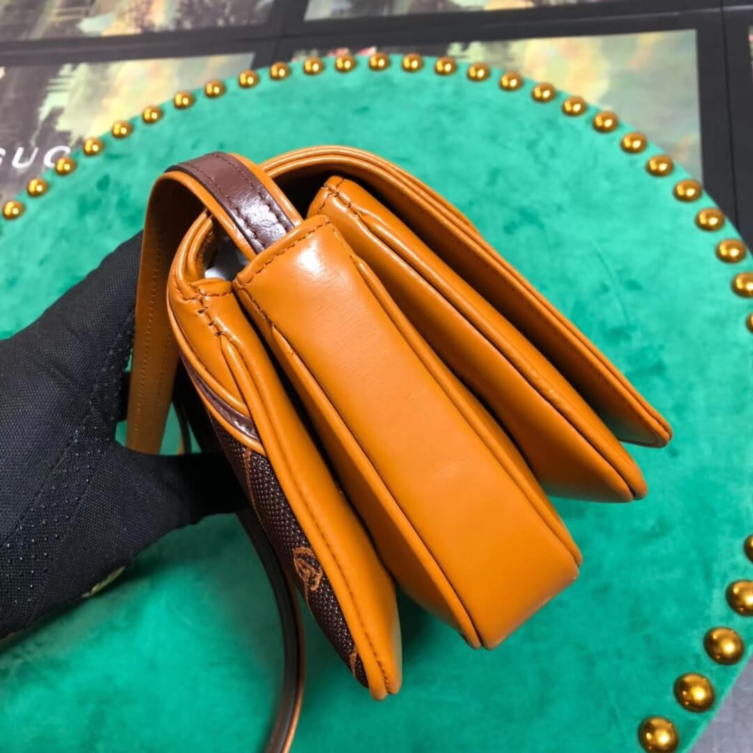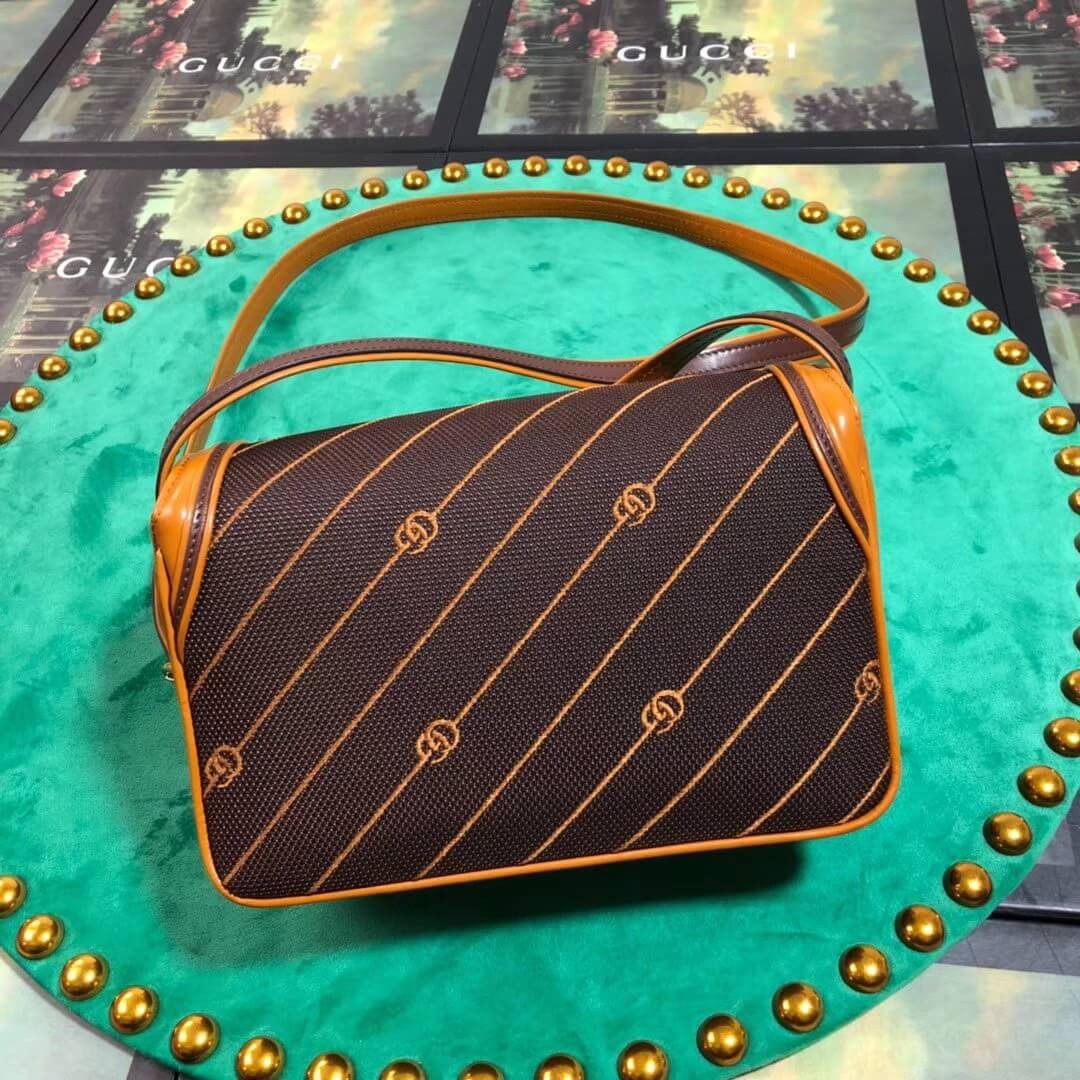 This bag also features a brown-colored canvas fabric with a double stripe logo print, and gold hardware. The front features the brand's interlocking "GG" logo at the center of the flap in a dark green and burgundy, and has dual crossing hardware embellishments below. The adjustable strap is made of a smooth leather in the two dominant colors of the bag, and can be worn over the shoulder or crossbody. The front flap has a snap-button closure, that opens up to reveal three separations in a beige textured-cotton lining, with two slip pockets for organization. Wear this original Gucci shoulder bag with knee-high leather boots and a wool cape for a glamorous autumnal outfit.