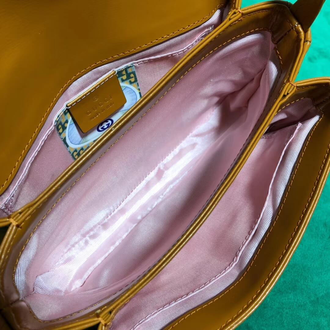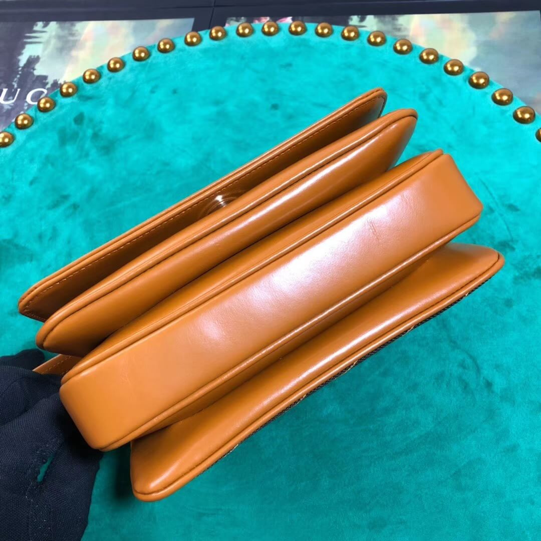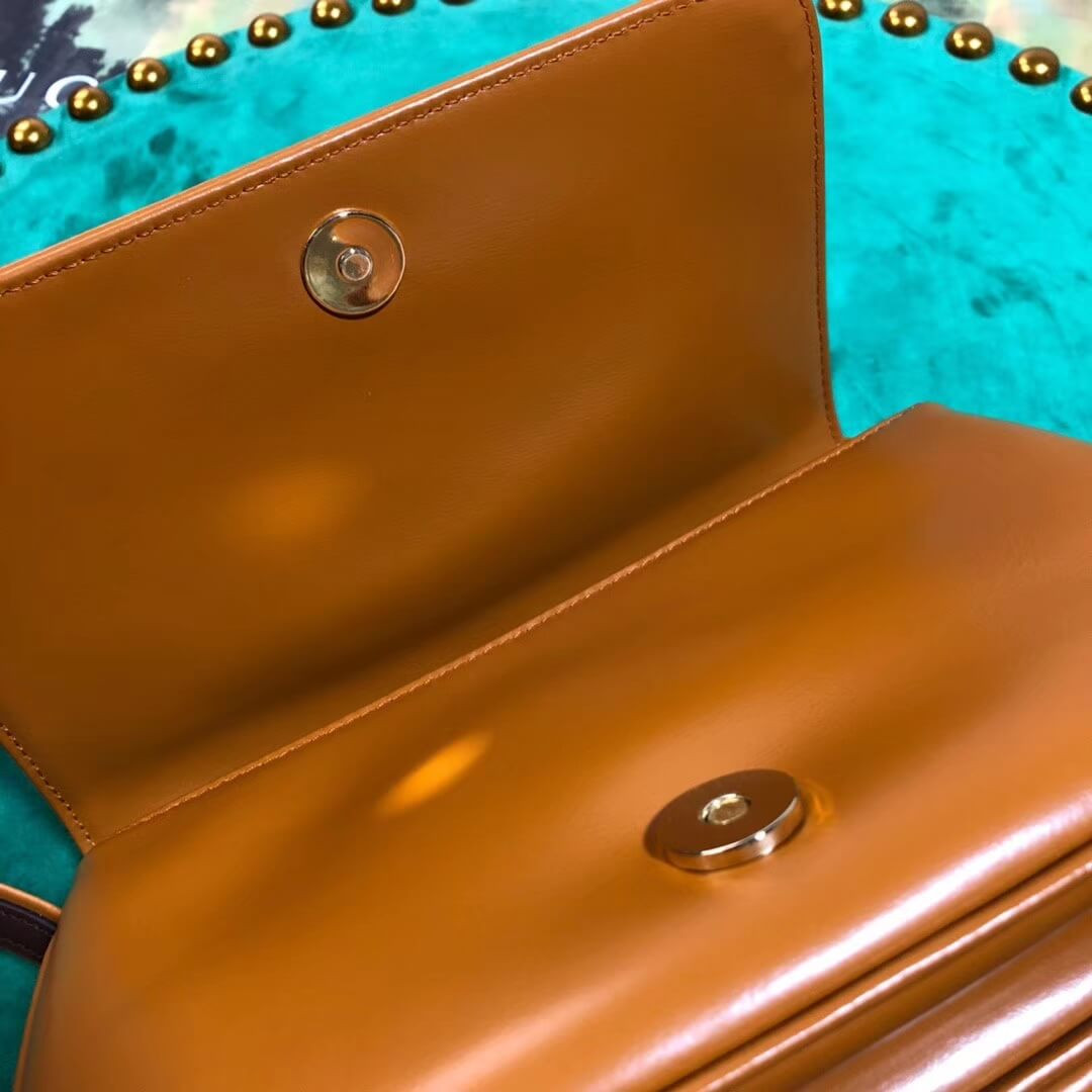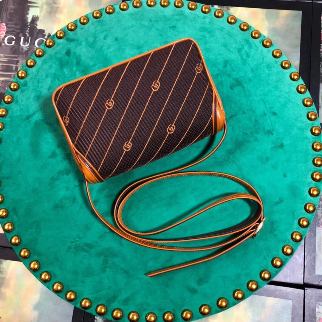 This bag also features a brown-colored canvas fabric with a double stripe logo print, and gold hardware. The front features the brand's interlocking "GG" logo at the center of the flap in a dark green and burgundy, and has dual crossing hardware embellishments below. The adjustable strap is made of a smooth leather in the two dominant colors of the bag, and can be worn over the shoulder or crossbody. The front flap has a snap-button closure, that opens up to reveal three separations in a beige textured-cotton lining, with two slip pockets for organization. Wear this original Gucci shoulder bag with knee-high leather boots and a wool cape for a glamorous autumnal outfit.
