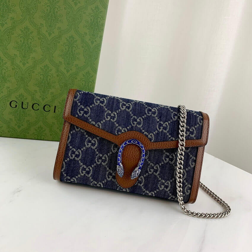 A part of the Epilogue collection, the mini Dionysus chain bag is presented with a strong logo feel in GG eco washed organic jacquard. Continuing to frame House codes in new ways, the bag's emblematic tiger head closure is enriched with vibrant blue enamel which complements the denim's dark shade. The style is completed by a contrasting leather trim.