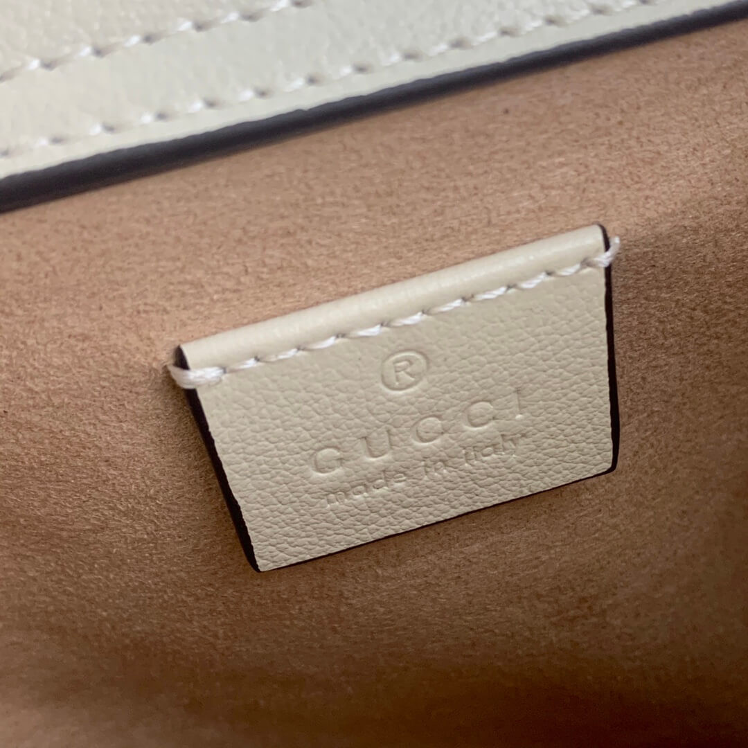 Combining recognizable elements of the House, the mini tote bag is defined by its bamboo handles and Double G hardware. Crafted from light blue leather, the accessory is further accentuated by two neon bands, a playful reference to the bands used to keep handles in shape.