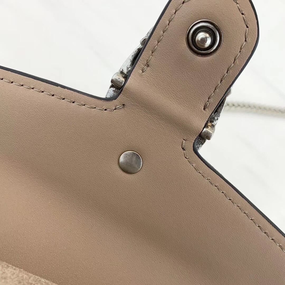 A structured GG Supreme canvas chain super mini bag with a key ring that can be used to attach this bag to a separate larger bag. The closure has the textured tiger head spur closure-a unique detail referencing the Greek god Dionysus, who in myth is said to have crossed the river Tigris on a tiger sent to him by Zeus.