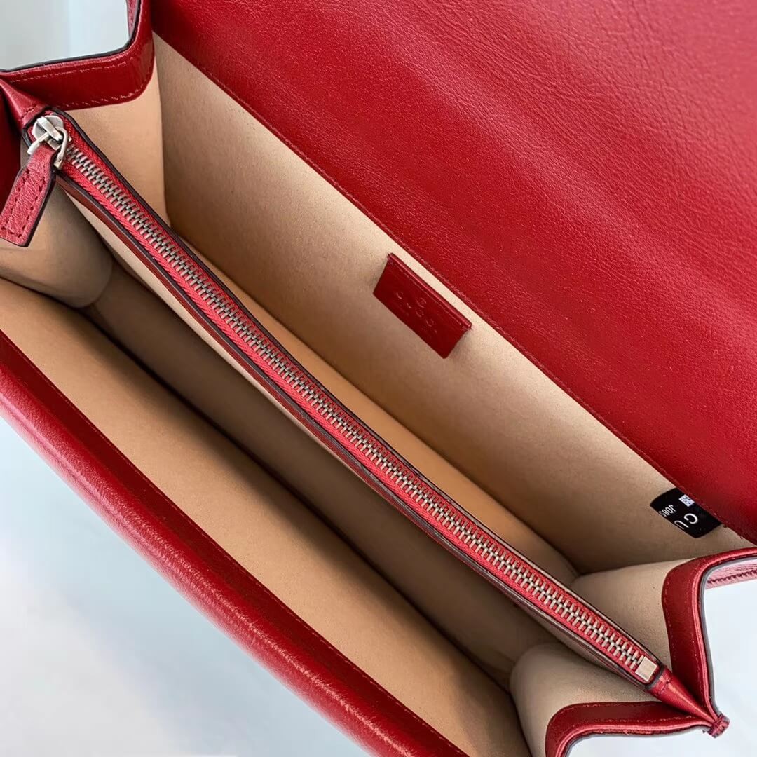 The Dionysus shoulder bag is reintroduced for Pre-Fall 2019 in white GG tweed trimmed with cerise leather. Imbued with an inherent ladylike feel, tweed continues to define a wide range of Gucci styles. The line is defined by the tiger head closure—a unique detail referencing the Greek god Dionysus, who in myth is said to have crossed the river Tigris on a tiger sent to him by Zeus. The sliding chain strap can be worn multiple ways, changing between a shoulder and a top handle bag.