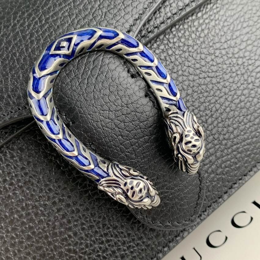 A message about leaving fashion’s old rules behind, the Epilogue collection conveys the idea that pieces should be timeless–not just in fashion for one season. Among the styles are Alessandro Michele’s most emblematic designs and motifs from the past 5 years like the Dionysus. One of the House's Beloved lines, the style is presented as a small shoulder bag in black, textured leather. Adding a colourful twist, electric blue enamel highlights the emblematic tiger head closure.