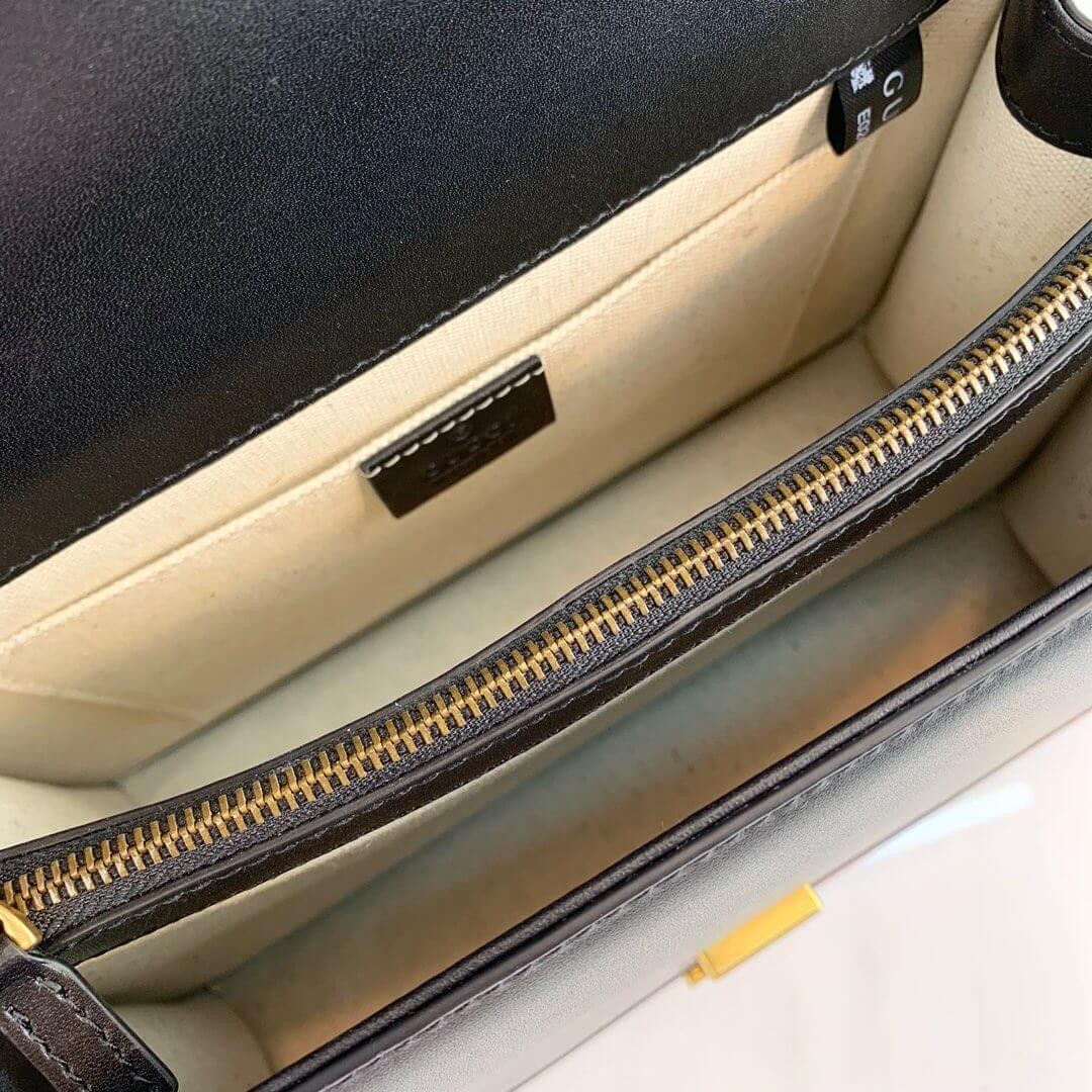 A structured contrast Dionysus bag in leather with the textured tiger head spur closure-a unique detail referencing the Greek god Dionysus, who in myth is said to have crossed the river Tigris on a tiger sent to him by Zeus. Made in fine grain leather, noted for its shine and softness.