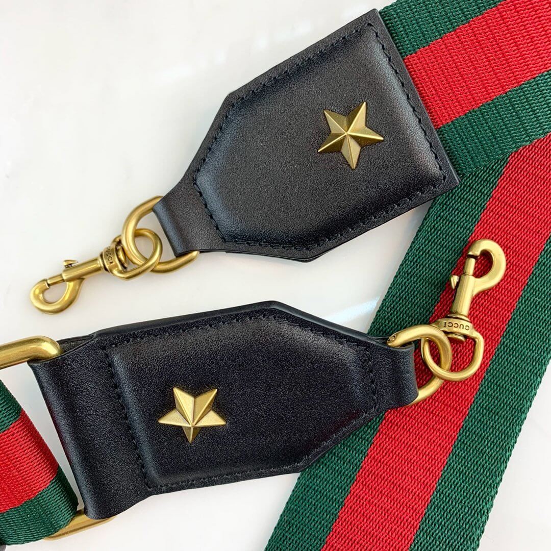 - Blue, Gucci green and hibiscus red leather