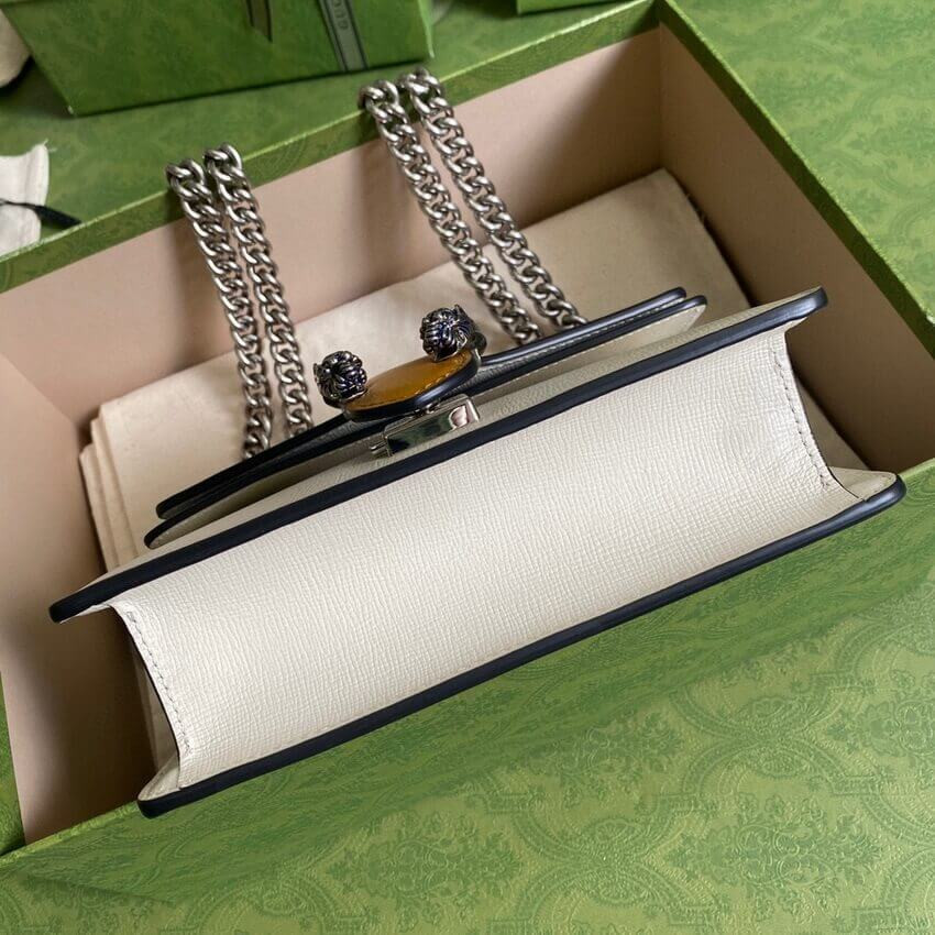 The Dionysus mini bag is presented in white textured leather with the now defining tiger head closure—a unique detail referencing the Greek god Dionysus. The closure is further enhanced with Swarovski crystals. The sliding chain strap can be worn multiple ways, changing between a shoulder and a top handle bag.