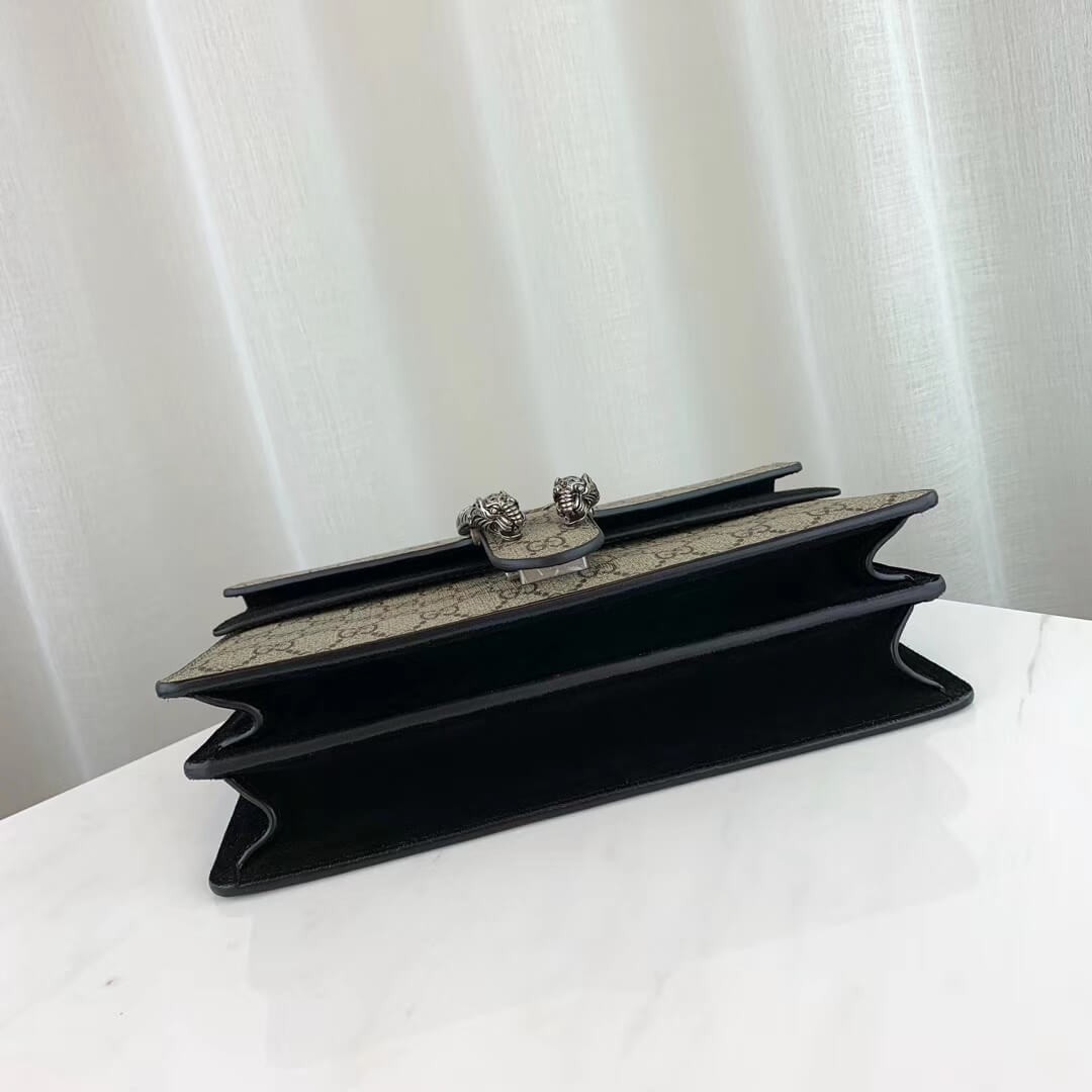 A structured GG Supreme canvas bag with our textured tiger head closure-a unique detail referencing the Greek god Dionysus, who in myth is said to have crossed the river Tigris on a tiger sent to him by Zeus. The sliding chain strap can be worn multiple ways, changing between a shoulder and a top handle bag.