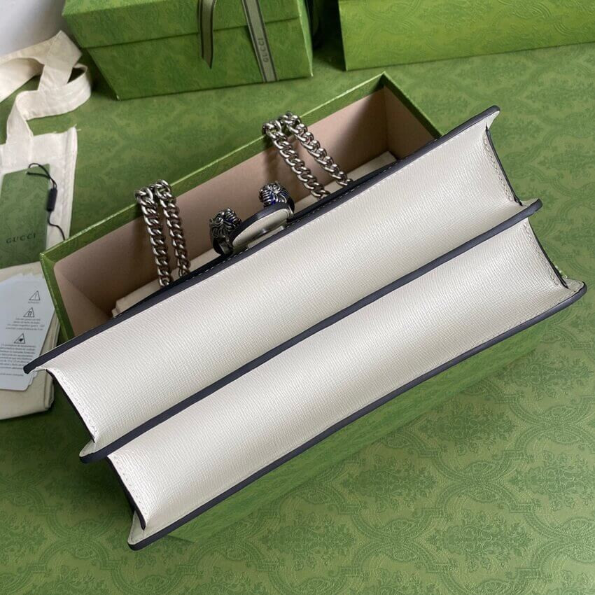 Inspired by a Greek myth, the Dionysus is known for its tiger-shaped closure. Here, the feline detail is paired with orange and white leather, accentuated by electric blue enamel. A sliding chain strap completes the small shoulder bag, allowing it to be carried in different ways.