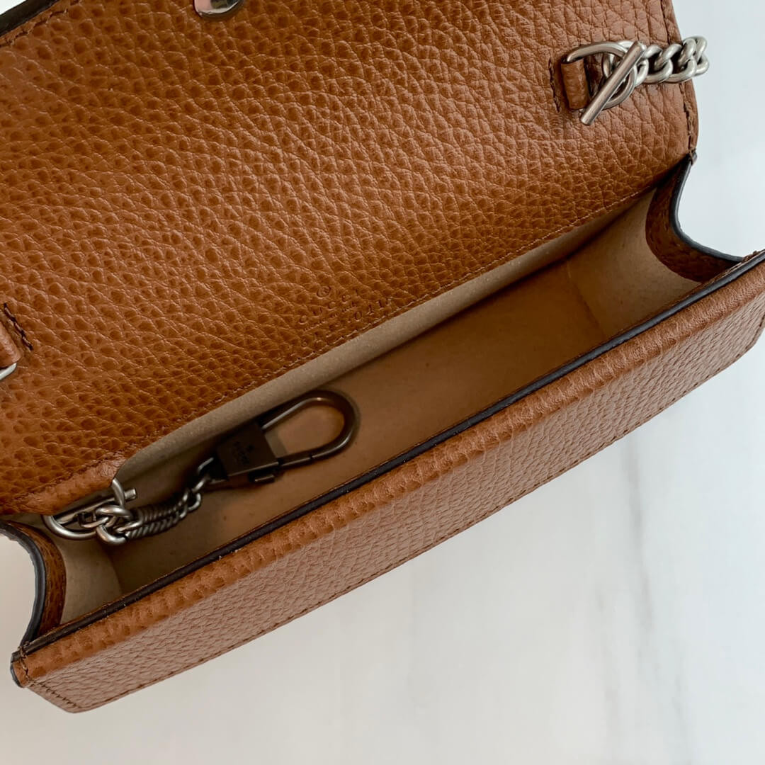 A part of the Epilogue collection, the super mini Dionysus is presented with a strong logo feel in GG washed organic jacquard. Continuing to frame House codes in new ways, the bag's emblematic tiger head closure is enriched with vibrant blue enamel which complements the denim's dark shade. The style is completed by a contrasting leather trim.