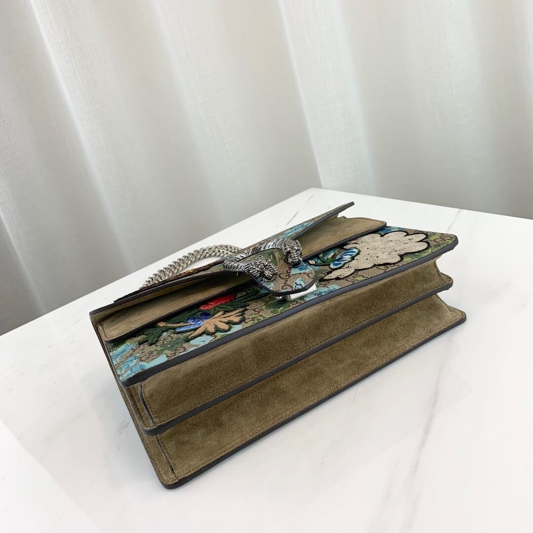 GUCCI GG Supreme Monogram Blooms Print Embroidered Small Dionysus Shoulder Bag Blue Taupe or 100% of your money back. This stunning shoulder bag is finely crafted of Gucci GG supreme monogram canvas in brown with a blue floral print overlay. This bag features embroidered bee and spring flower embroidered designs, an aged silver chain looping shoulder strap, and a tiger head horseshoe closure. This shoulder bag opens to a brown suede and GG canvas interior with a frontal patch pocket. This is a remarkable shoulder bag for everyday essentials with the style and sophistication from Gucci!