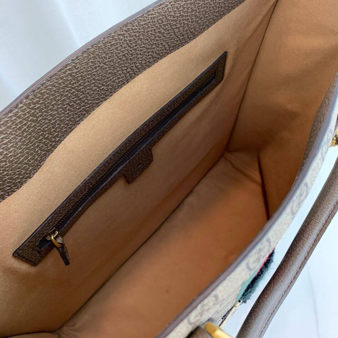 This stylish tote is crafted of Gucci GG monogram coated canvas with webbing and a stitched bee design on the front. The bag features rolled top handles, an optional, adjustable shoulder strap with gold hardware, and brown leather trim. The top opens to a spacious dark grey microfiber interior with zipper and patch pockets. This stylish tote is suitable for light travel.