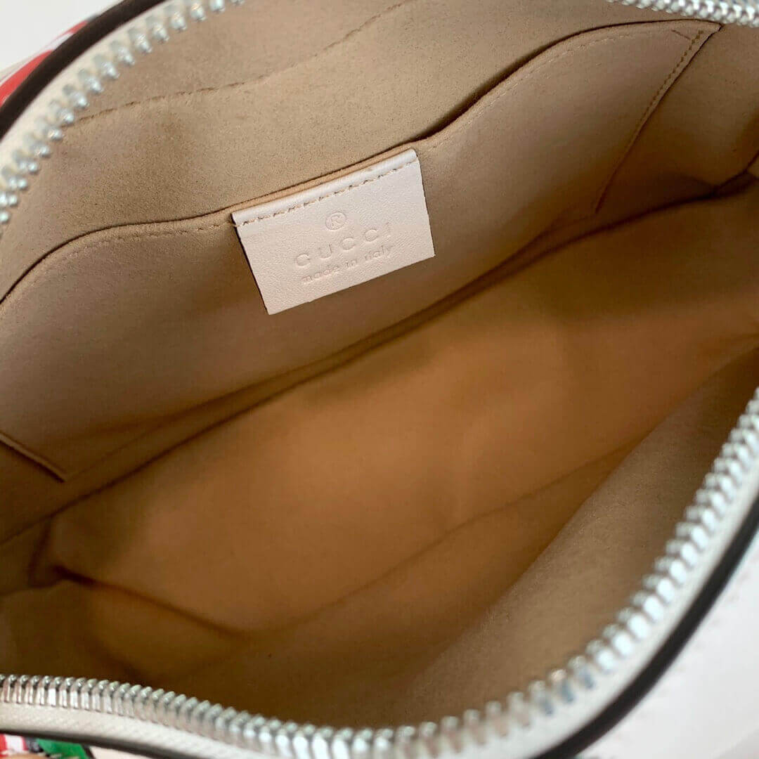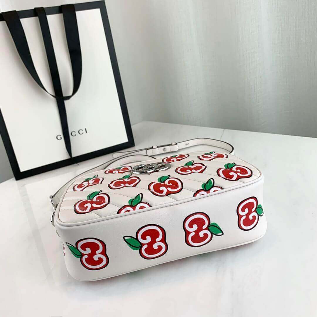 A special collection of styles features cartoon-style apples playfully set against the GG Marmont's matelassé leather in white. The distinctive shape has a softly structured design with a zip top and Double G hardware.