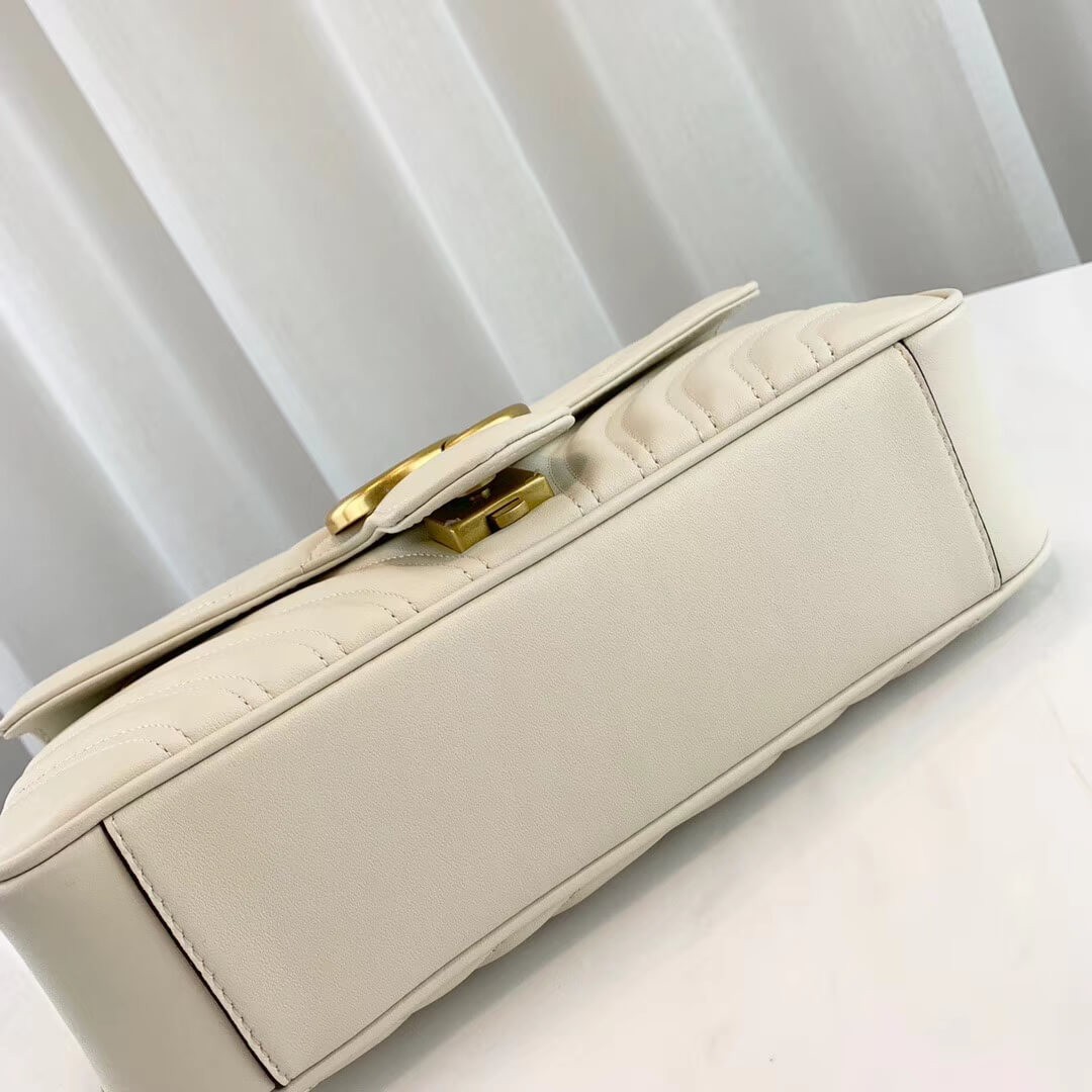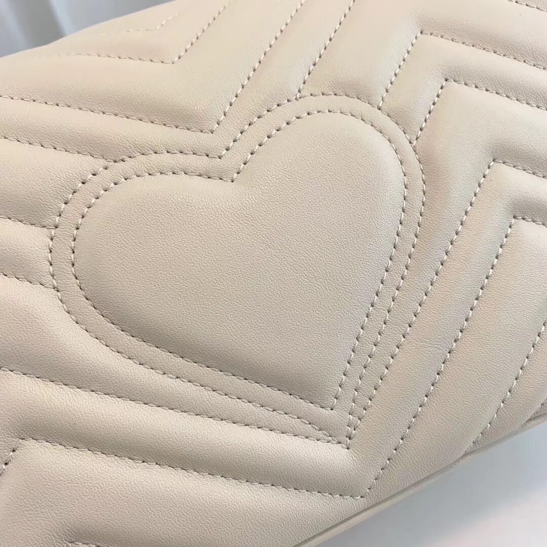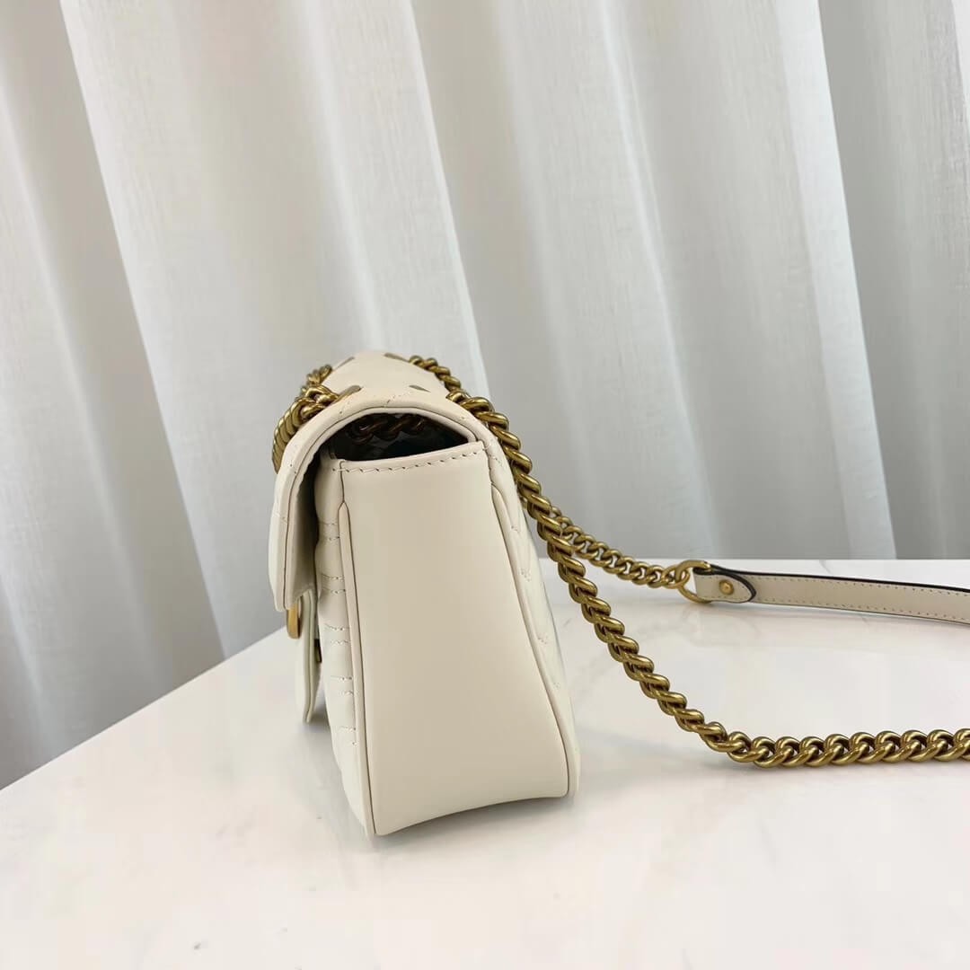 The small GG Marmont chain shoulder bag has a softly structured shape and an oversized flap closure with Double G hardware. The sliding chain strap can be worn multiple ways, changing between a shoulder and a top handle bag. Made in matelassé chevron leather with a heart on the back.